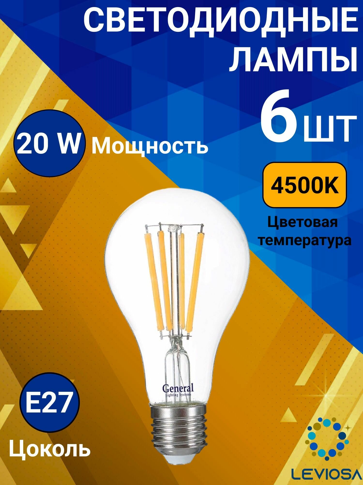 Светодиодные лампы филаментная диммируемая, General, Комплект из 6 шт., Мощность 20 Вт., Цоколь Е27, Дневной свет