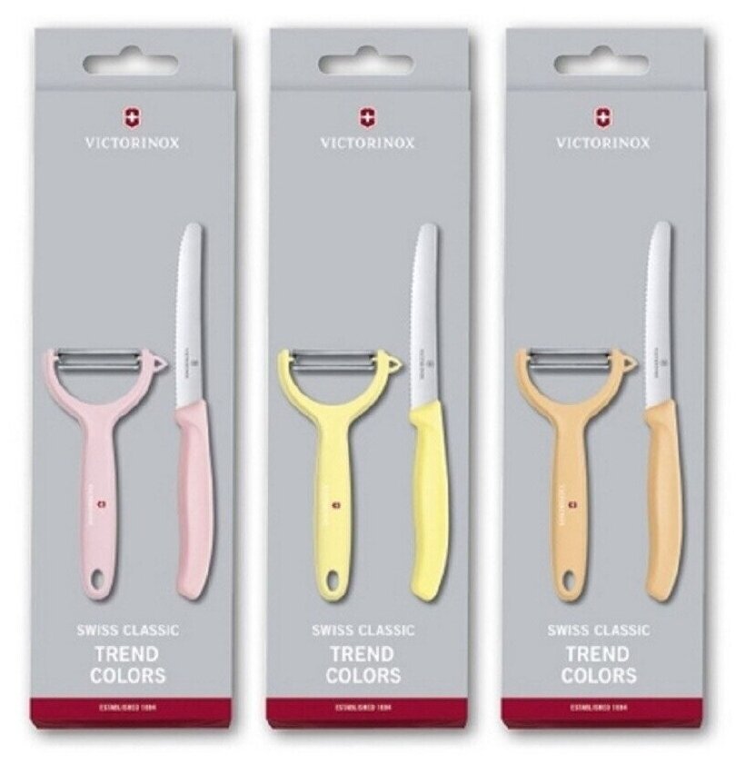 | Комплектация | Набор из 2-х кухонных ножей VICTORINOX Swiss Classic Trend Colors: нож для томатов с волнистой заточкой 11 см; нож для томатов и киви с двойным поворотным лезвием и с серрейторной кромкой; подарочная коробка. |