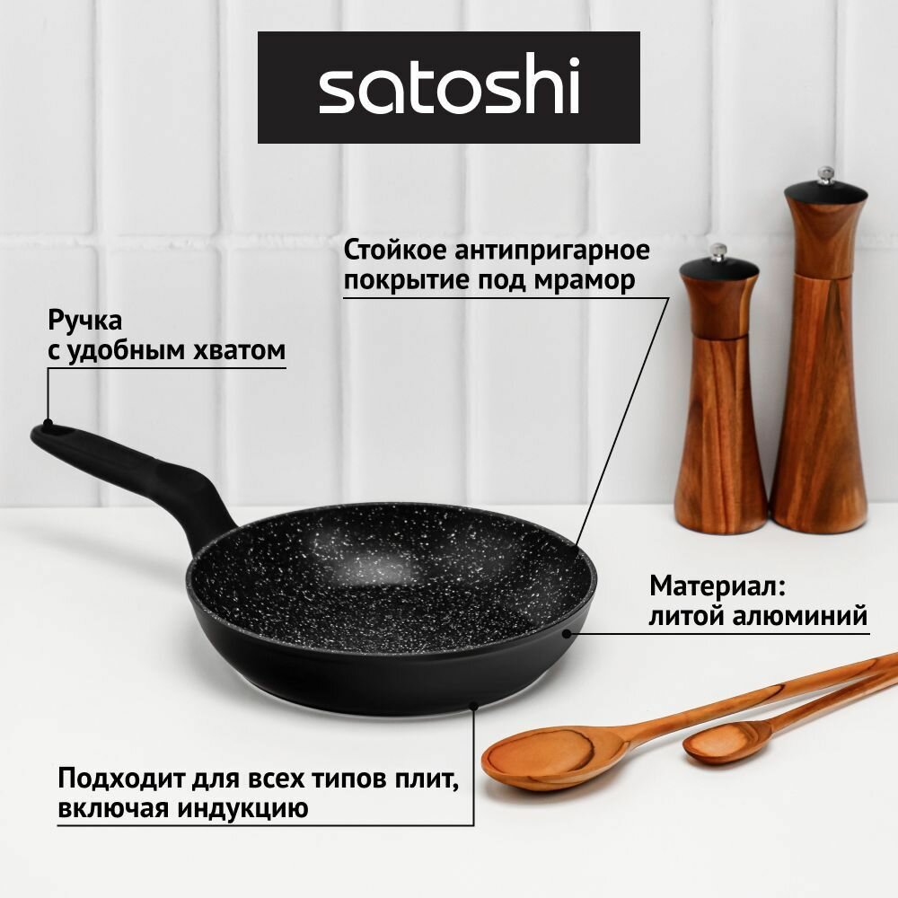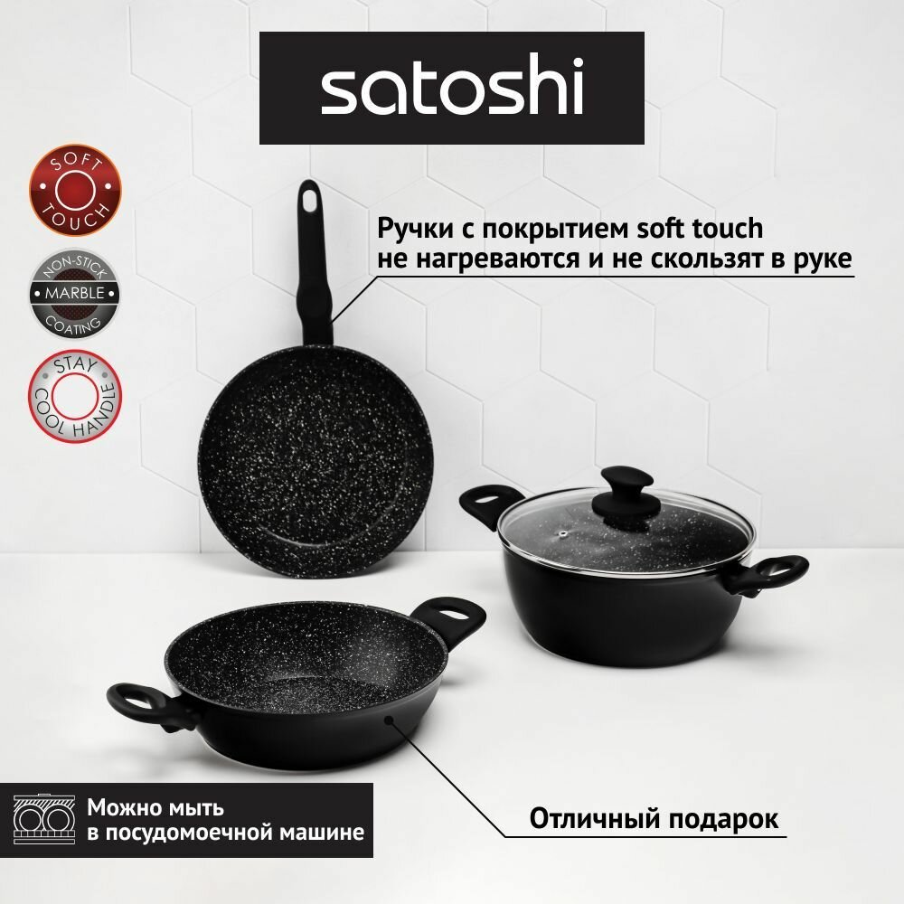 СохранитьНабор посуды SATOSHI Стоун для приготовления: сковорода, сотейник, кастрюля, крышка, антипригарное покрытие мрамор интересное: