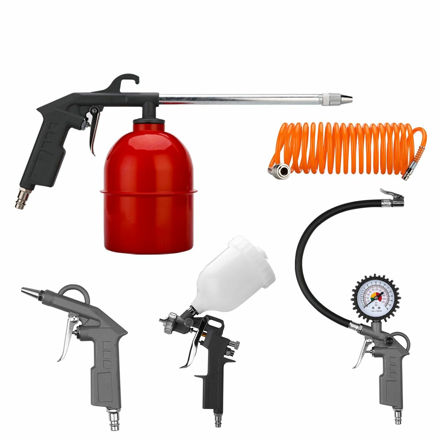 | Комплектация | краскораспылитель с верхним бачком, пистолет для накачивания воздуха с манометром, пистолет для вязких жидкостей с нижним бачком, продувочный пистолет, шланг |