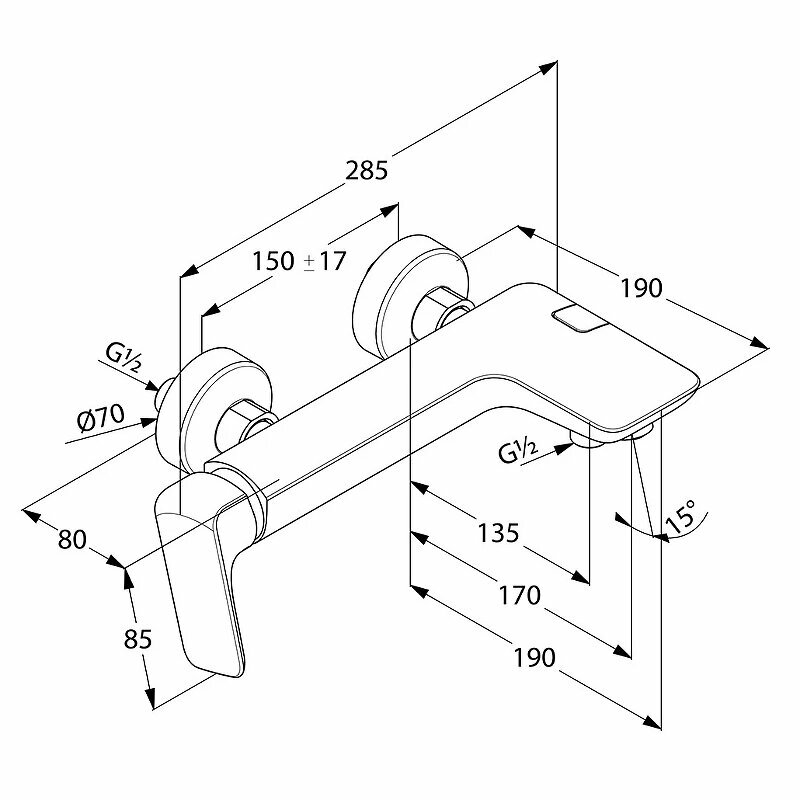 Настенный смеситель Kludi Ameo, арт. 416710575, неповоротный излив, с выходом на душ (без лейки), с боковым рычагом и автоматическим переключателем ванна/душ