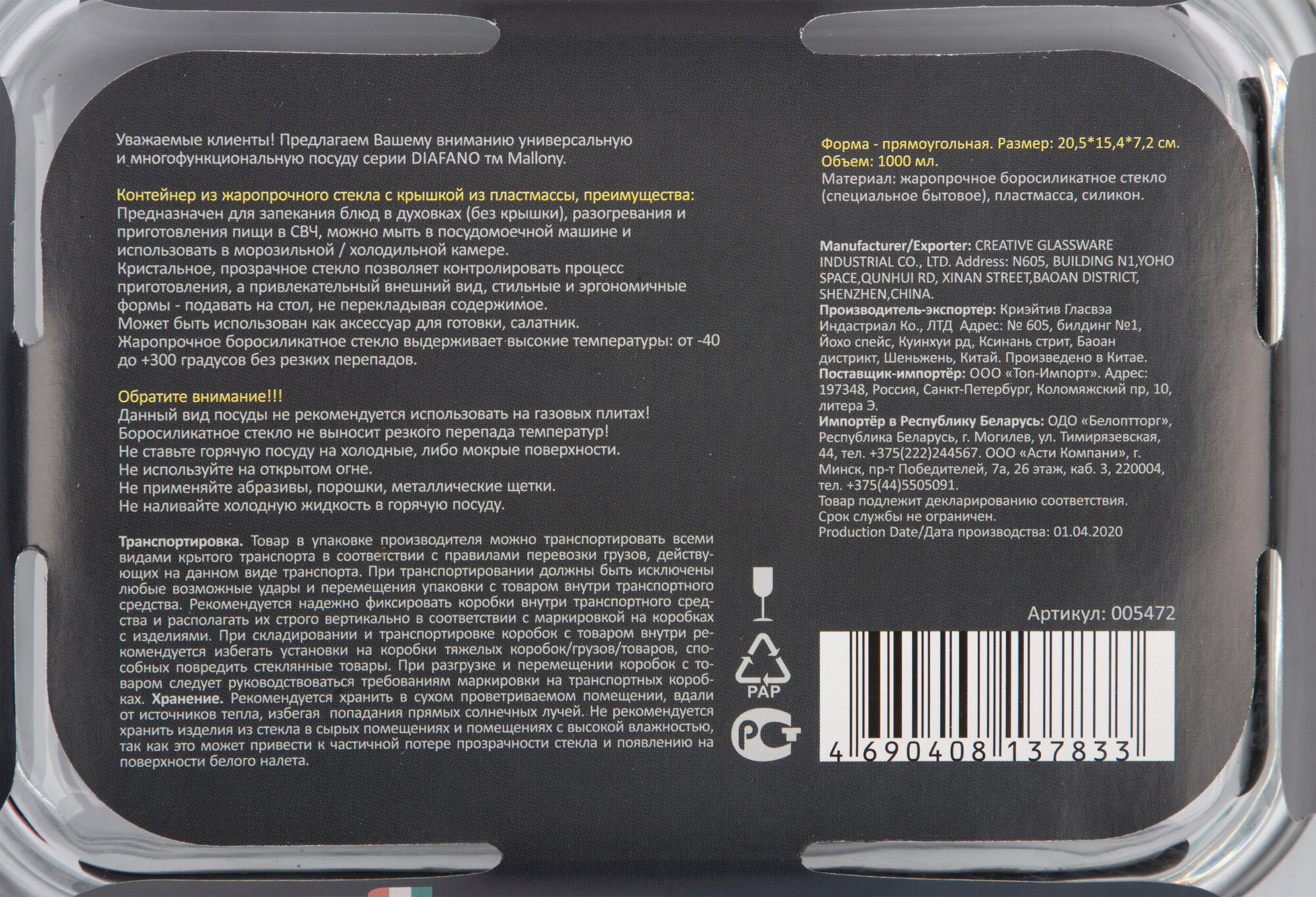 | Дополнительная информация | толщина стекла 5.5 мм; материал крышки - пластик/силикон; выдерживает температуры от -20°С до +200°С без резких перепадов, температура термического шока (нагрев/резкое охлаждение) 85°С; нельзя использовать на газовых плитах, открытом огне, не рекомендуется использовать в духовке |