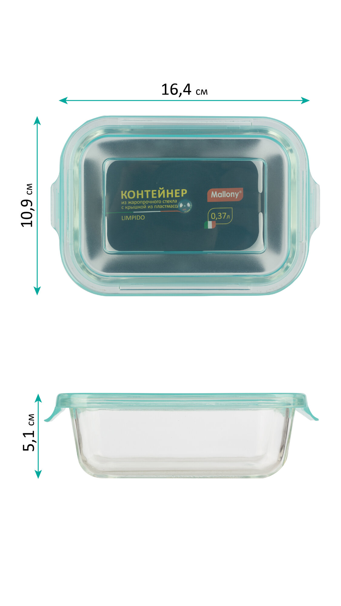 Контейнер Mallony Limpido 650 мл из жаропрочного стекла с крышкой из пластмассы прямоугльный, темпер .