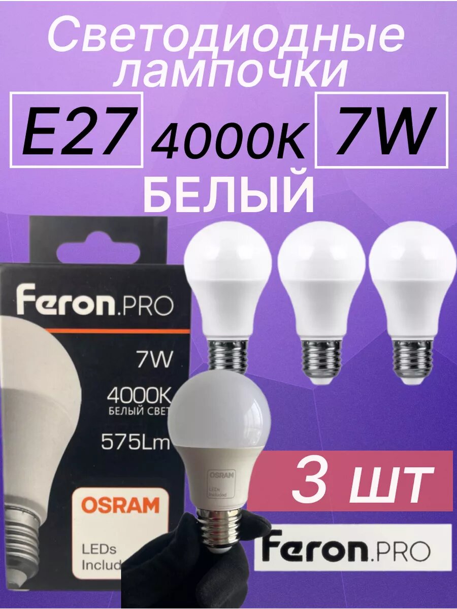 Купить Лампа светодиодная FERON LB-1007, E27, 7W, 4000K, белый свет, 3 шт