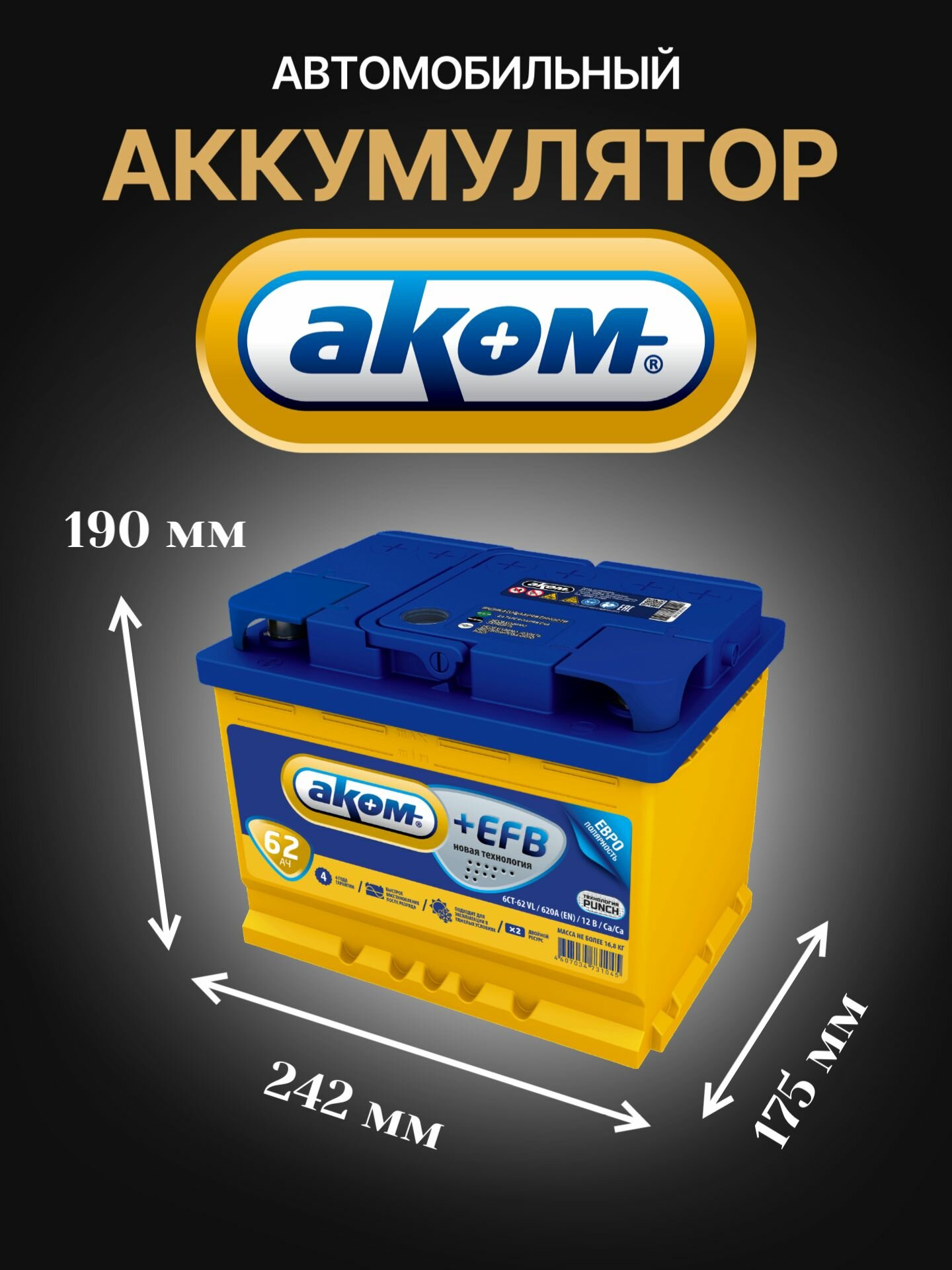 Аккумулятор автомобильный АКОМ + EFB 62Ач L+ EN620A прямой полярности