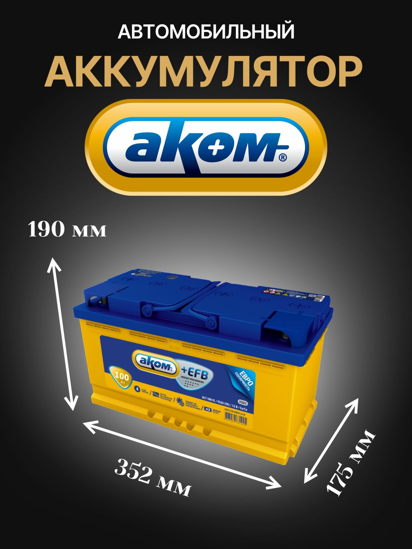 Аккумулятор Аком +Efb 100 А/Ч Обратная R+ 353X175x190 En950 А АКОМ арт. 6CT-100.0