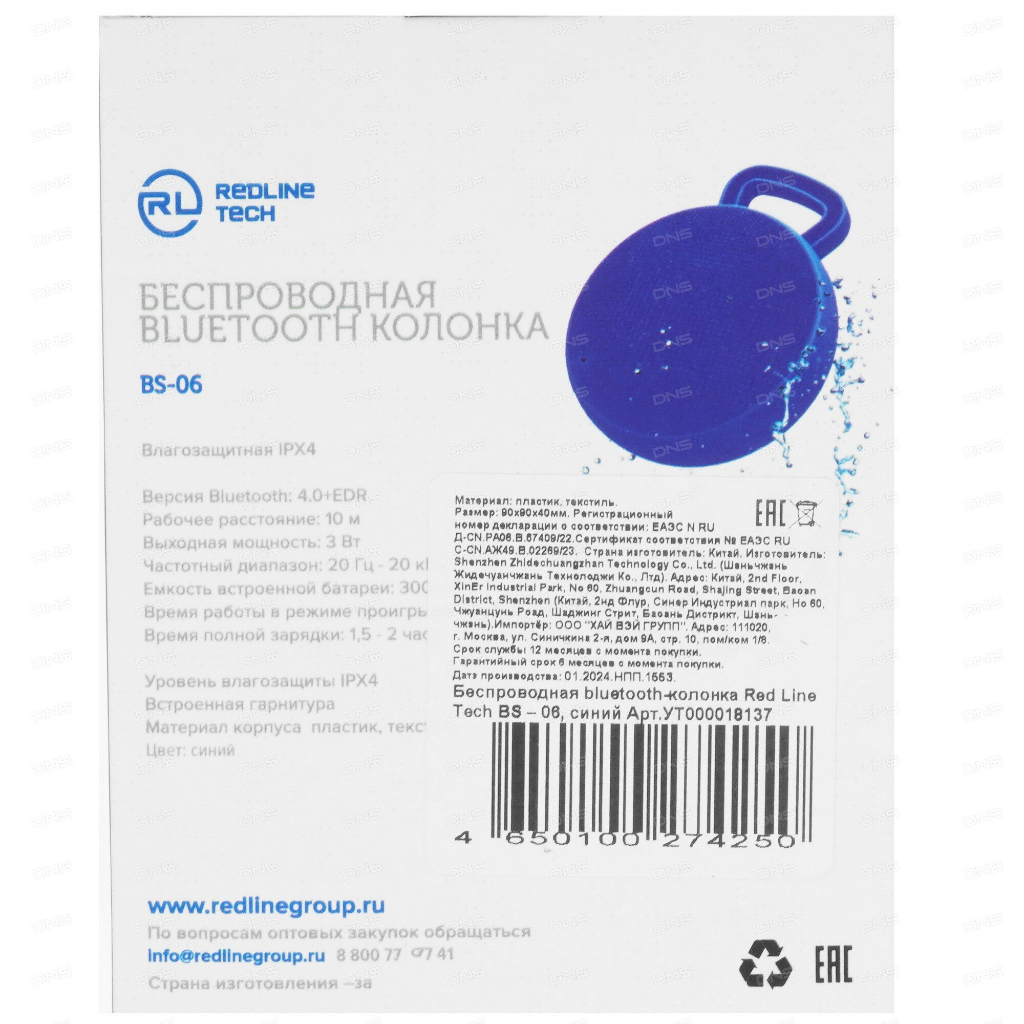 Портативная акустика Redline Tech BS-06 синий 2.0 BT (УТ000018137)