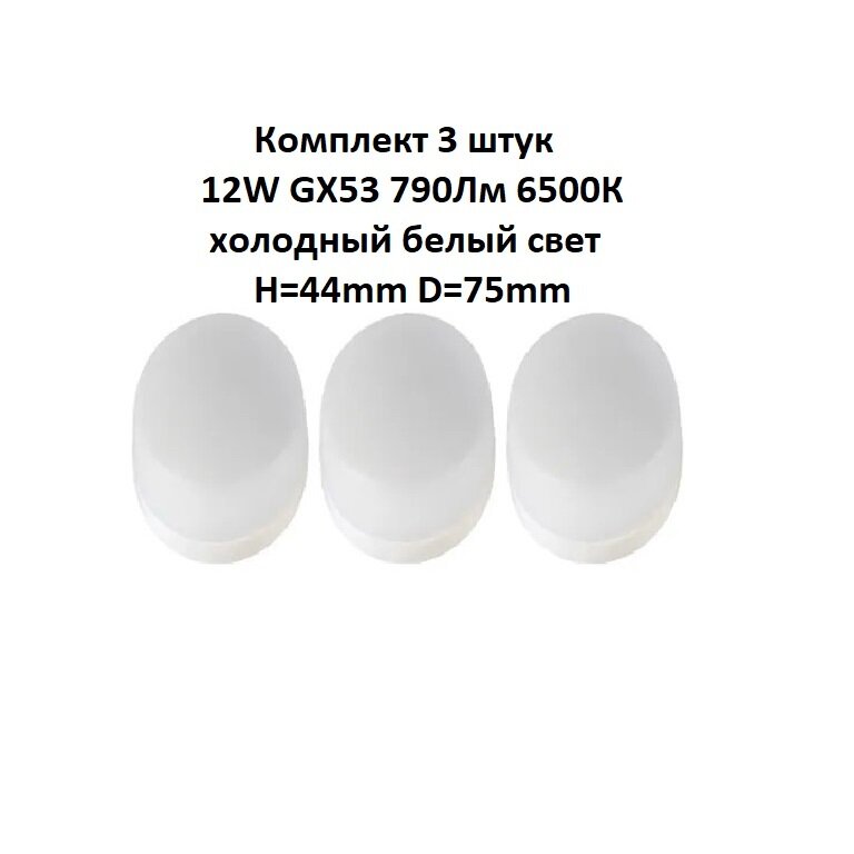 (3 шт.) Светодиодная лампочка General GX53 12W 6500K 6K 75x44 купол пластик GLDEN-GX53-12-230-GX53-6500 660358 Холодный белый. Цоколь GX53