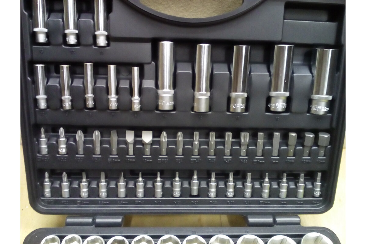 | Плюсы: | Есть всё, что нужно. 6-гранные головки. Твердая резина на трещотках, которая не впитывает масло. Время покажет, но первое впечатление, что его нельзя сломать, можно только потерять. До уровня б-га нужно только докупить набор комбинированных ключей :) |