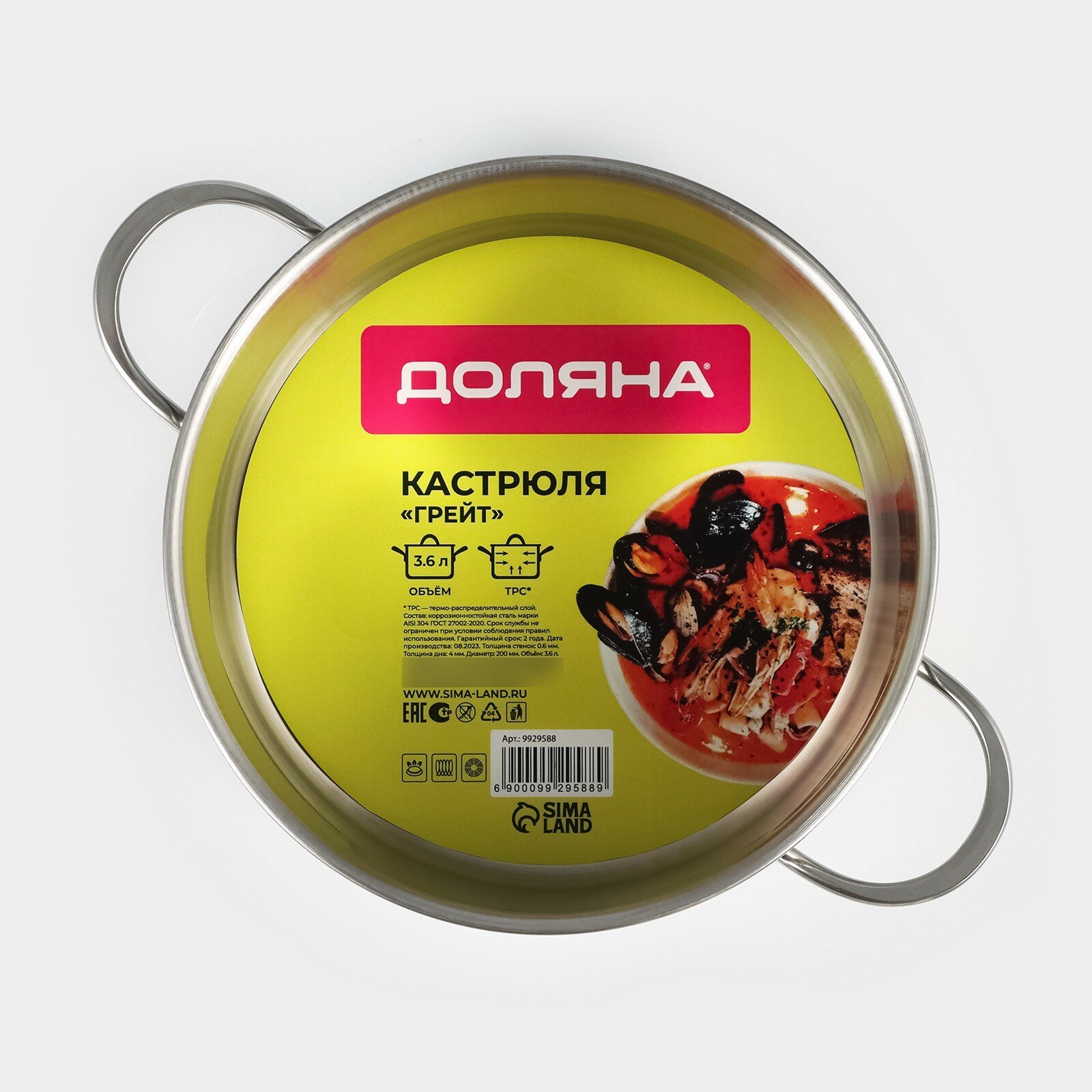 Кастрюля из нержавеющей стали Грейт, 3,6 л, капсульное дно, индукция Доляна 9929588 .