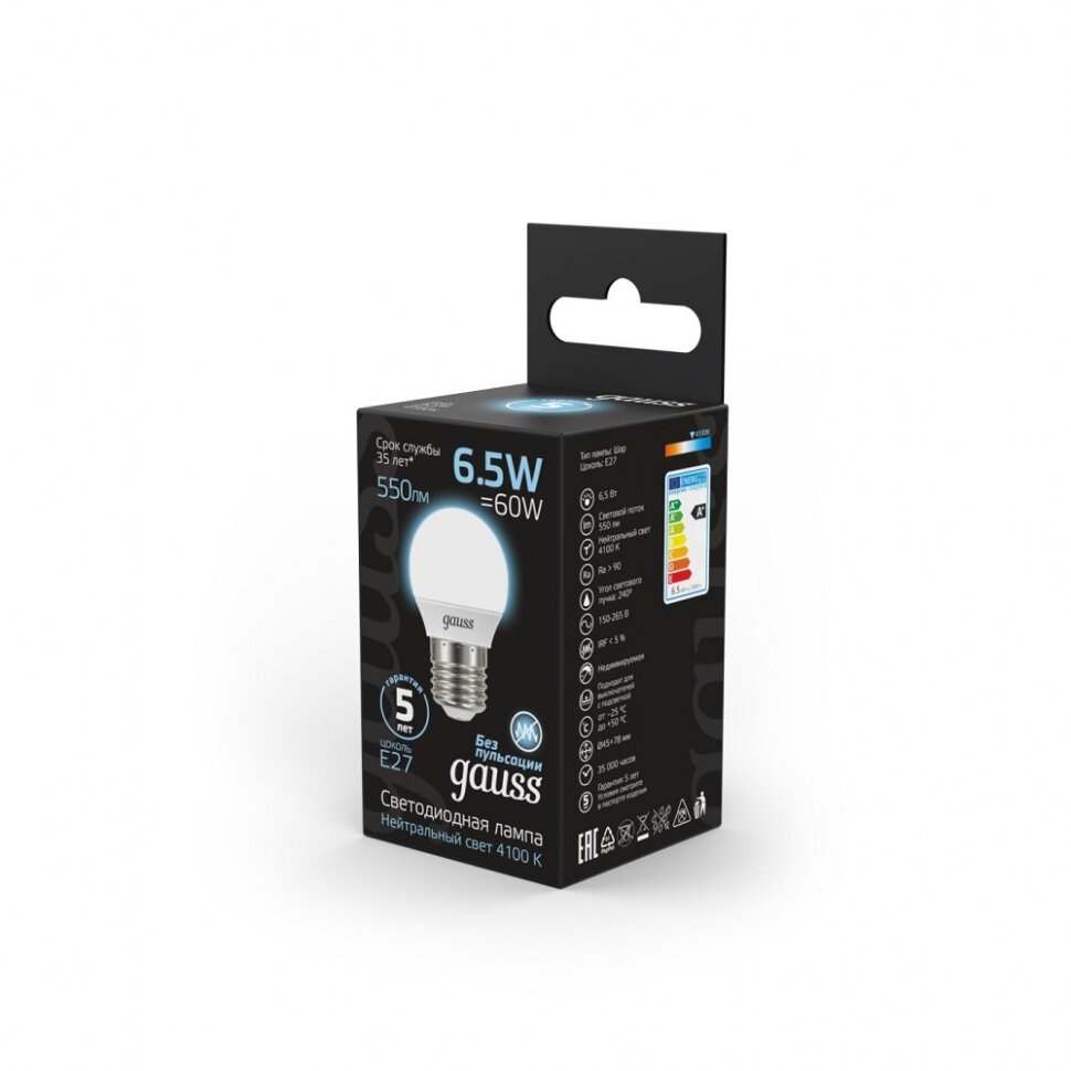 Лампа светодиодная Black 6.5Вт шар 4100К бел. E27 550лм 150-265В Gauss GAUSS 105102207 (1 шт.)