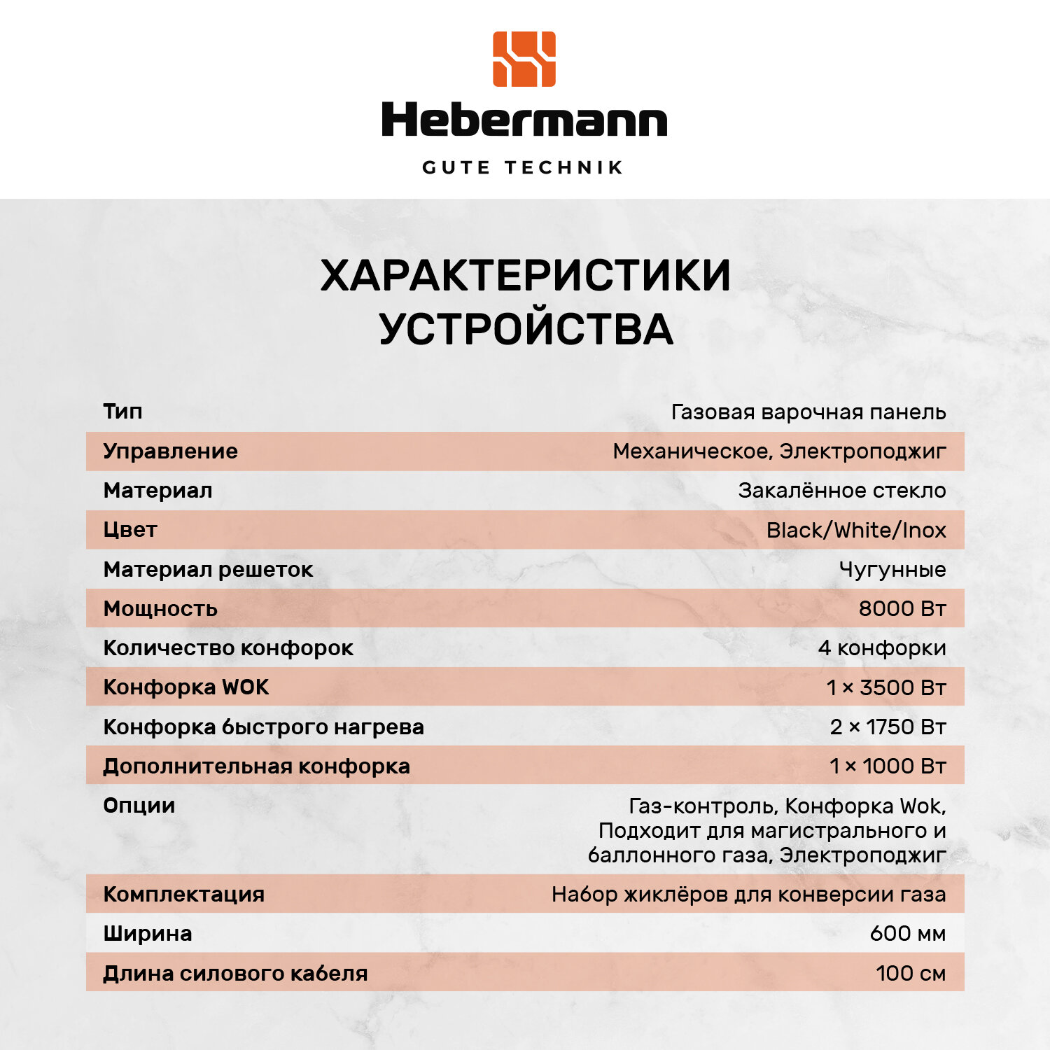 Варочная панель, газовая 4 конфорки Hebermann HBGG 604.1 W,Материал поверхности: Закалённое стекло Материал решёток: Чугун Термостойкие ручки Hitech Управление: Механическое, Электроподжиг, Газ-контроль