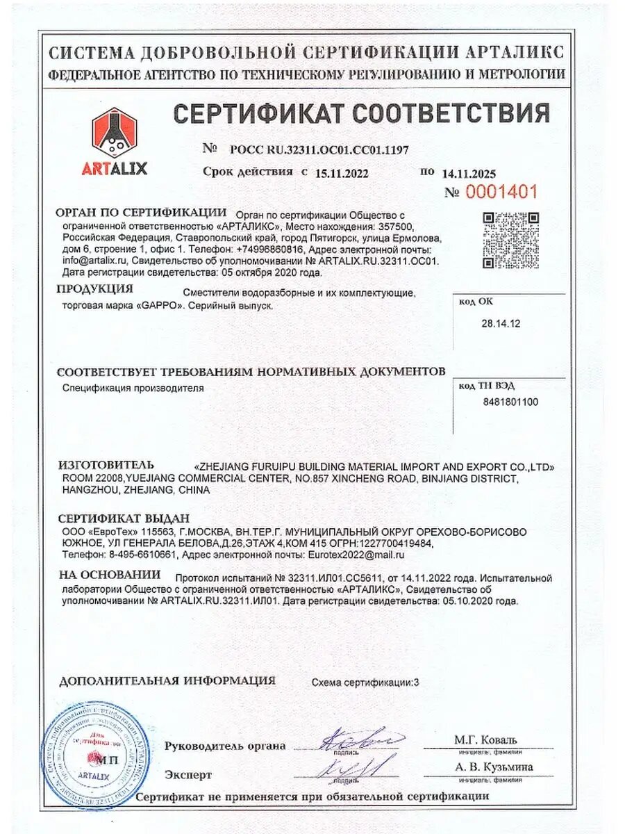 | Запорный клапан | керамический картридж |