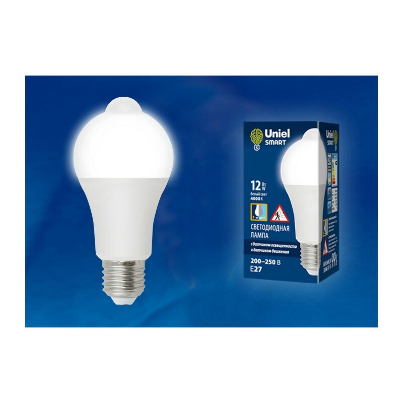 Uniel Светодиодная лампа Uniel, LED-A60-12W, 12 Вт, 4000 K, E27,PLS10WH, датчик освещенности, движ