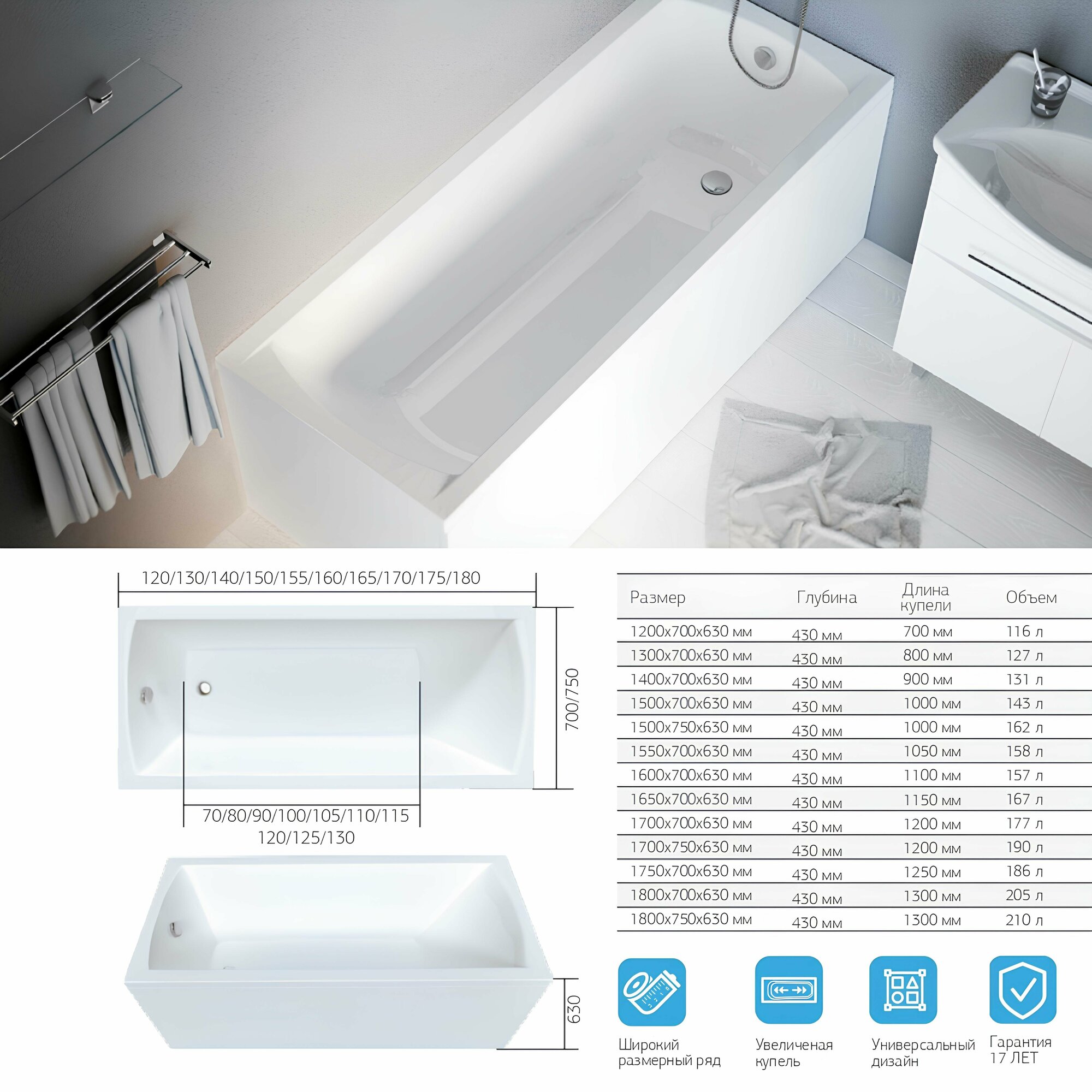 Акриловая ванна 175x70 см прямоугольная Marka One MODERN 01мод1750