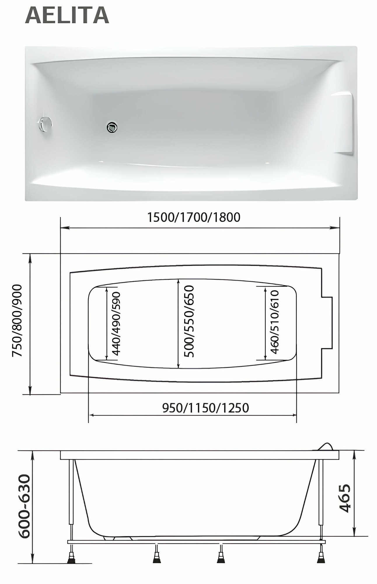Ванна акриловая 170х75 см AELITA комплект 3в1: Прямоугольная ванна, металлический каркас, слив-перелив 01ае1775кс2+