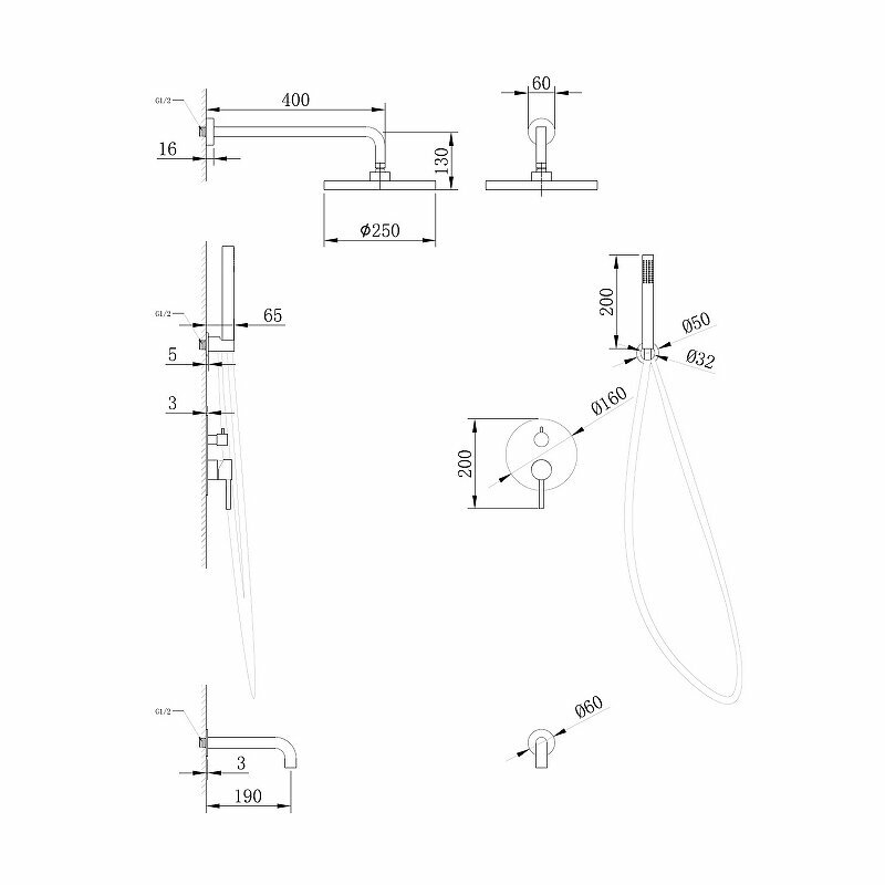 | Комплектация | ручной душ / лейка / излив для набора воды / верхний душ / шланг / кронштейн / держатель лейки |