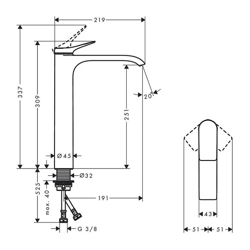 Vivenis Смеситель для раковины, однорычажный, 250 без сливного гарнитура, для раковины в форме таза 75042000, хром
