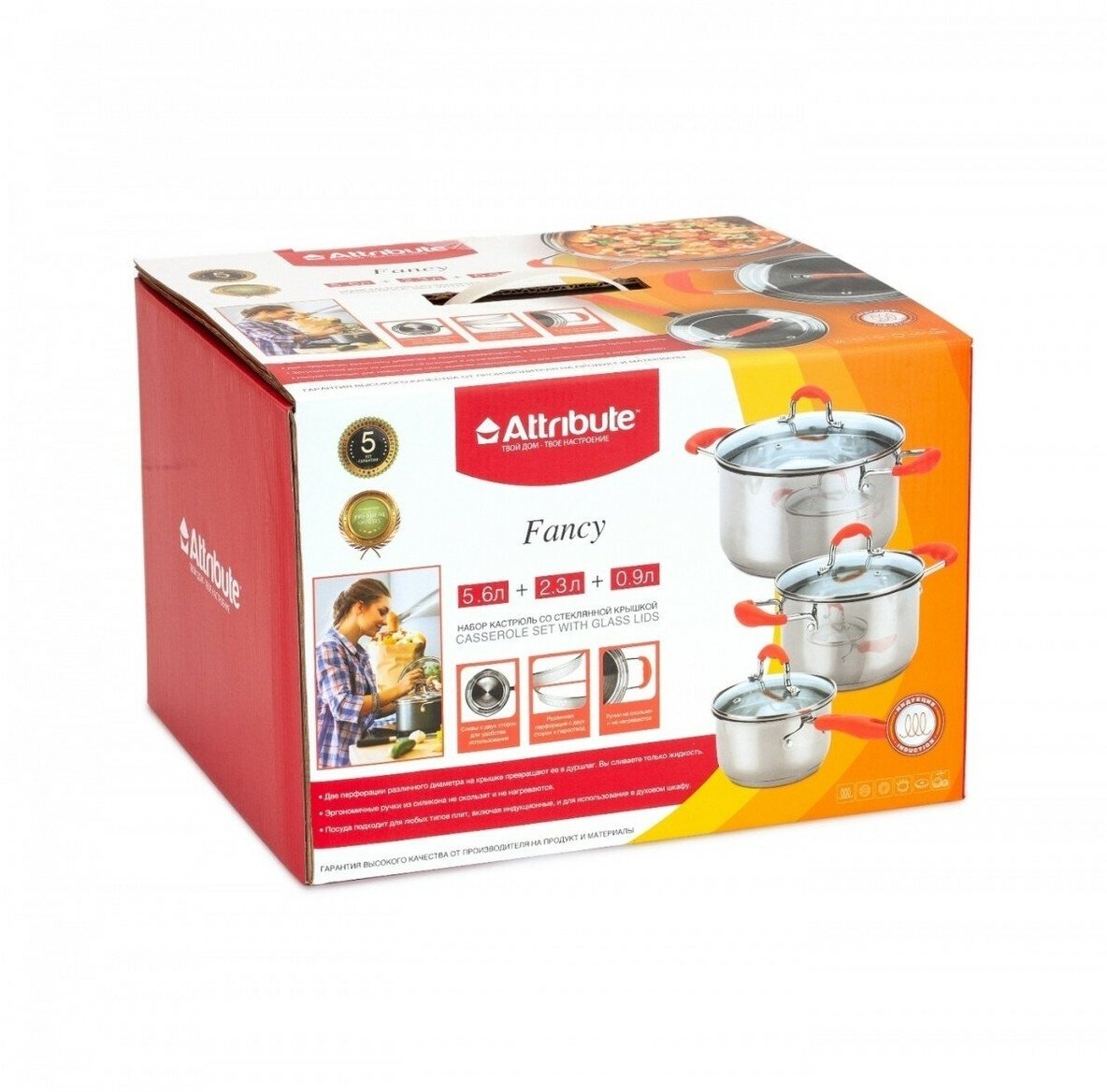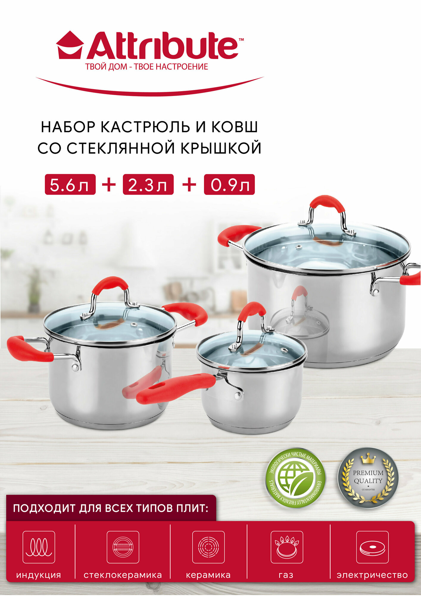 Набор посуды ATTRIBUTE STEEL FANCY 6пр. (ковш 0.9л + кастрюли 2.3л, 5.6л), ASF002