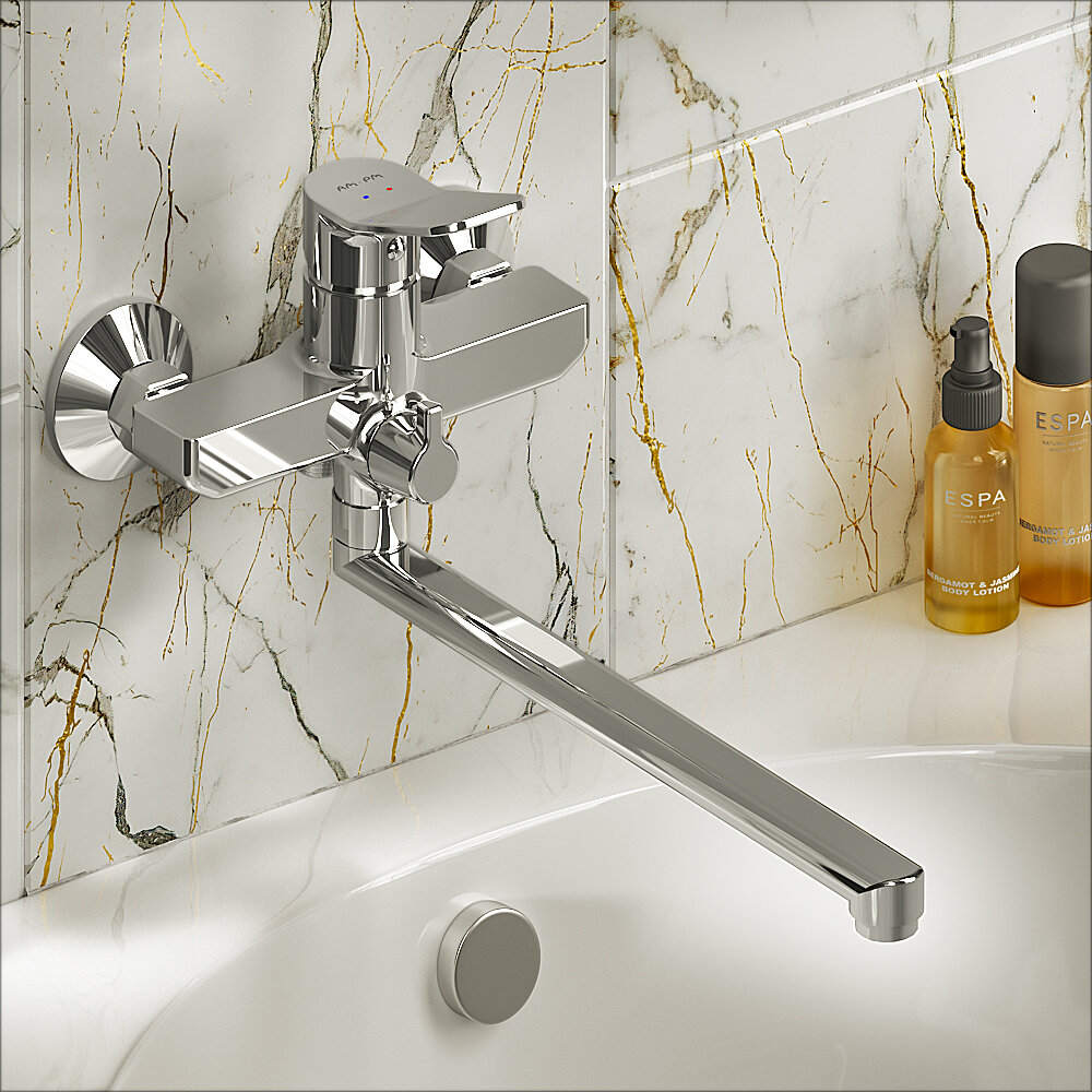 Смеситель для ванны с душем AM.PM Brava, с длинным поворотным изливом 300 мм, латунь, хром