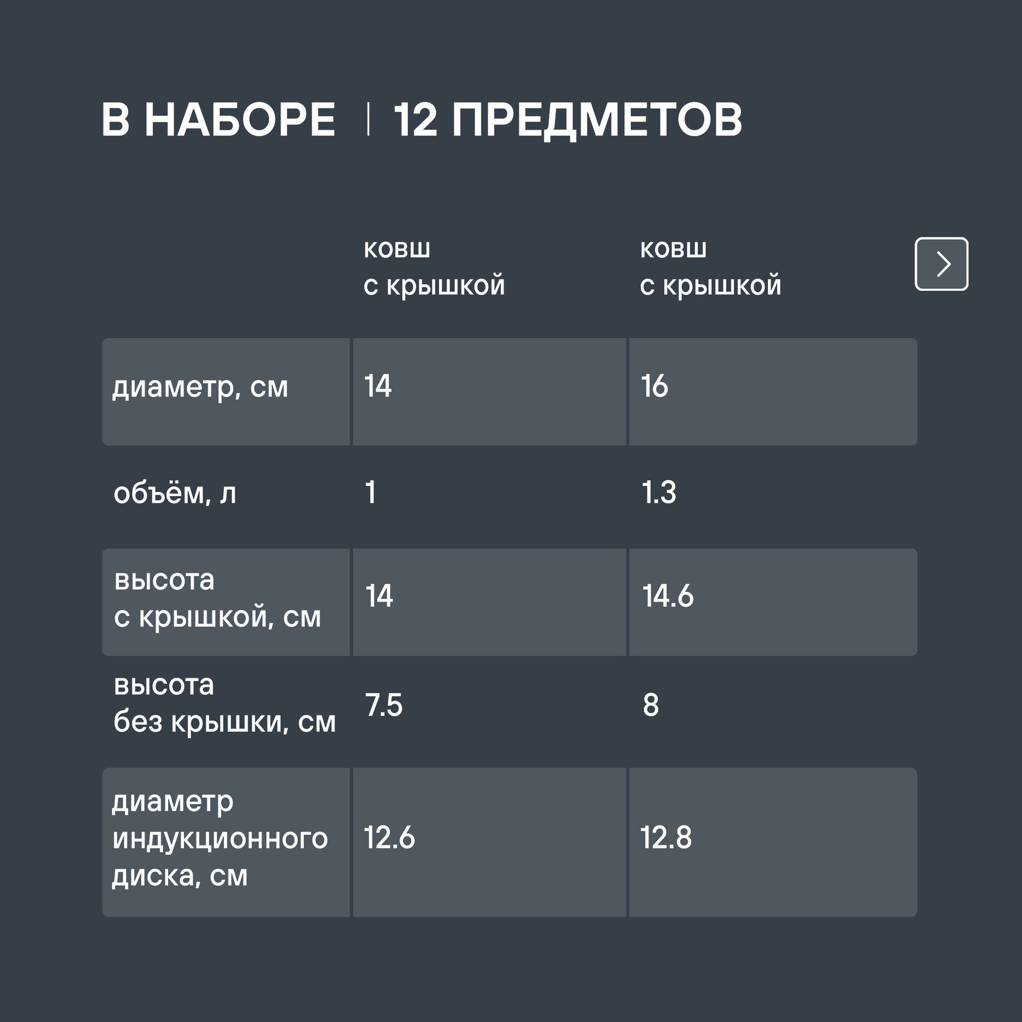 | Комплектация | 3 кастрюли: 2.3 л, 3.2 л, 5.7 л; 2 ковши: 1.0 л, 1.3 л; 2 сковороды; крышка (5 шт.) |