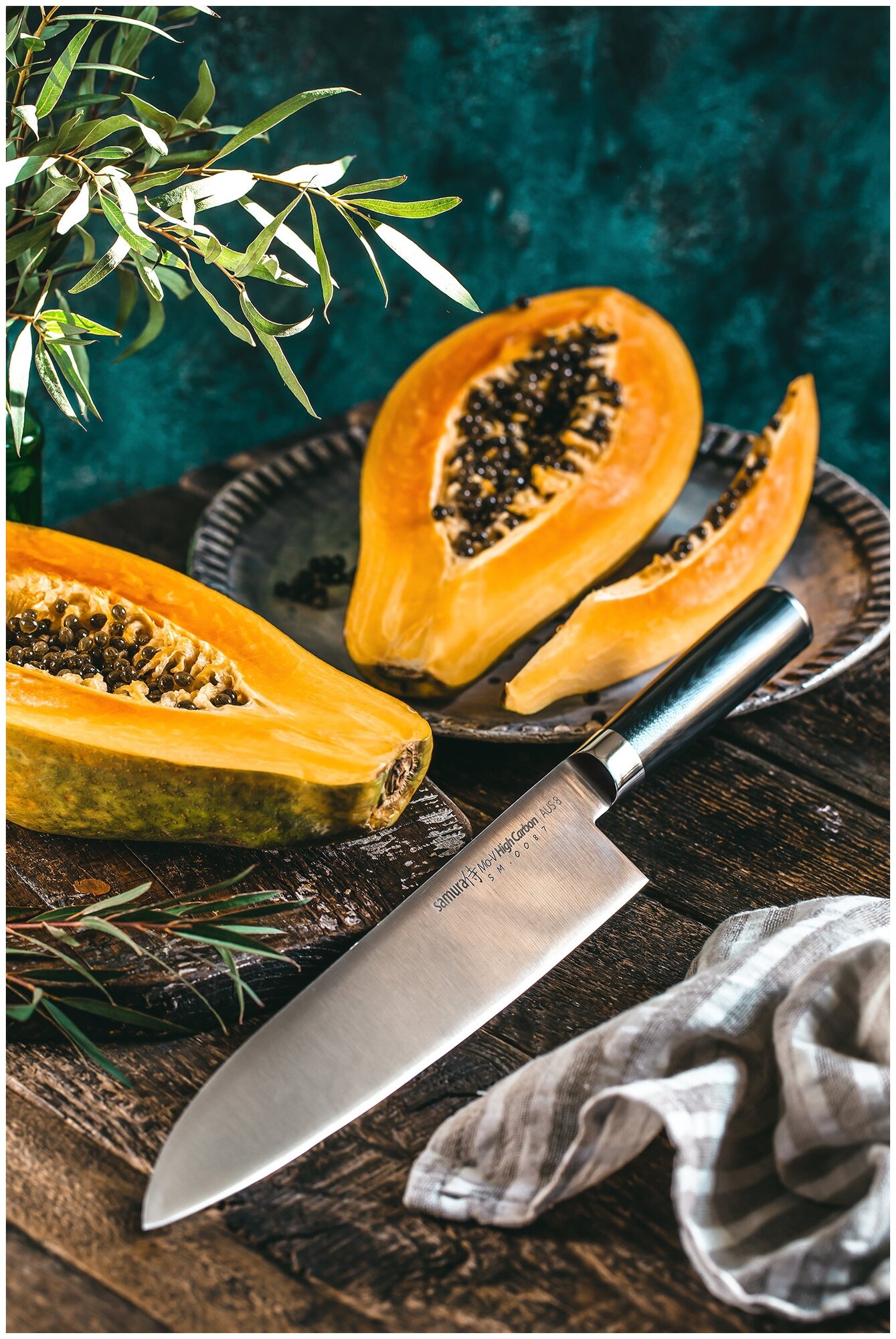 У родителей самура шеф нож более 10 лет и по их мнению он лучший, решил прикупить два шеф ножа, распаковав я понял, что в руке нож лежит так же как и нож родителей, увесистый, острый, сталь звенит. Не заморачивайтесь, Япония не Япония, самура изначально делалась в Китае по японской технологии. Ну для примера айфон из за того, что его собирают в Китае хуже не стал, а за эти ножи могу сказать, что мне понравились