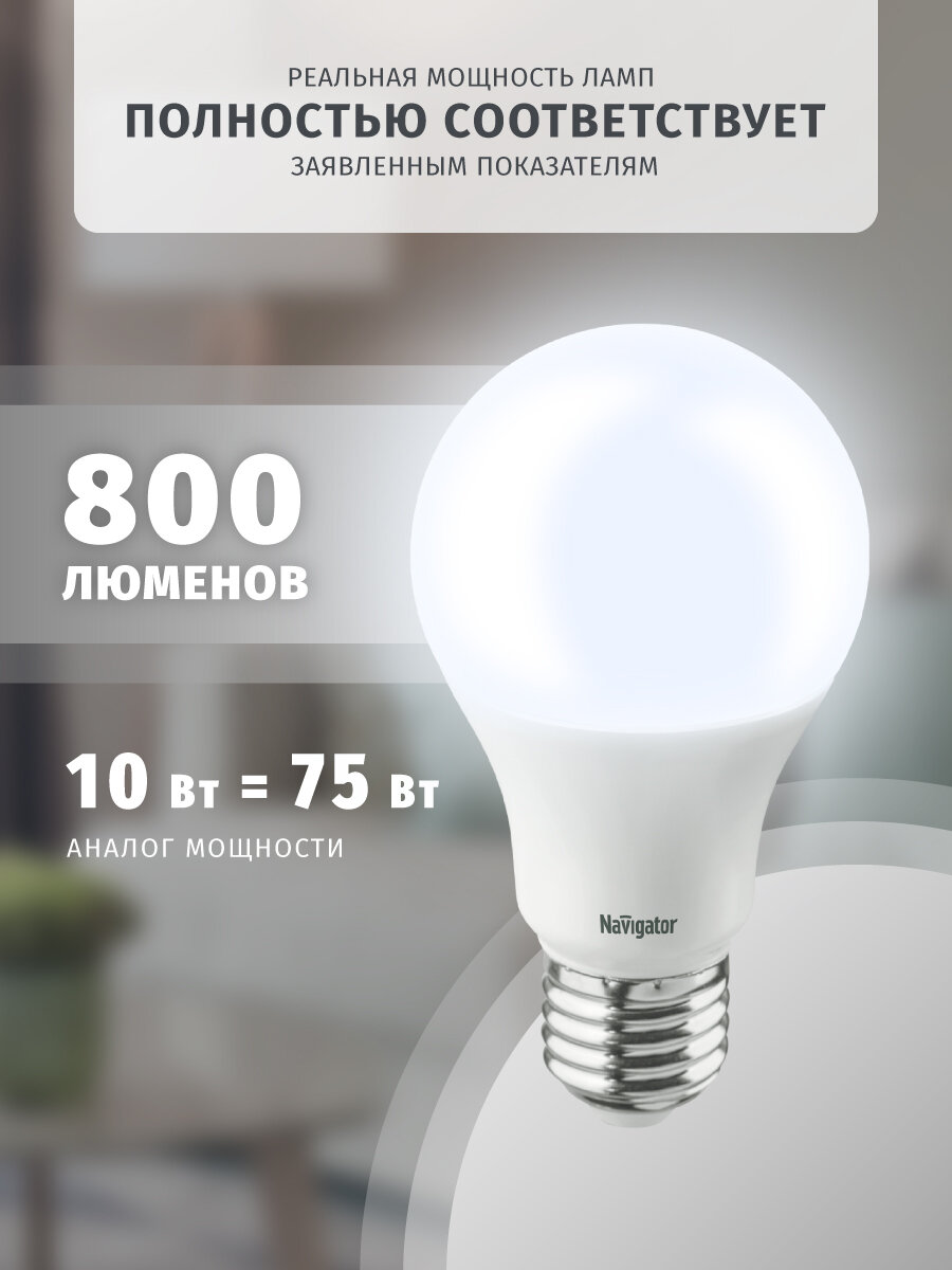 Лампа светодиодная Navigator 61 237, 10 Вт, груша, Е27, холодный свет 6500К, упаковка 10 шт.