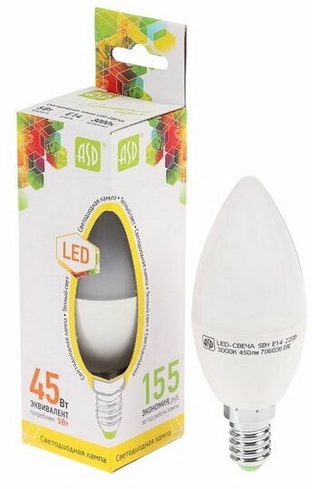 Лампа светодиодная ASD LED-СВЕЧА-STD 3000K, E14, C37, 5 Вт, 3000 К