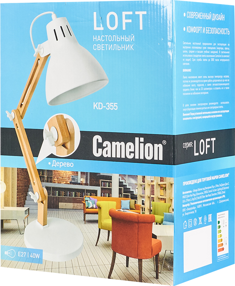 Camelion KD-355 C01 белый (Светильник настольный,230V 40W E27) .