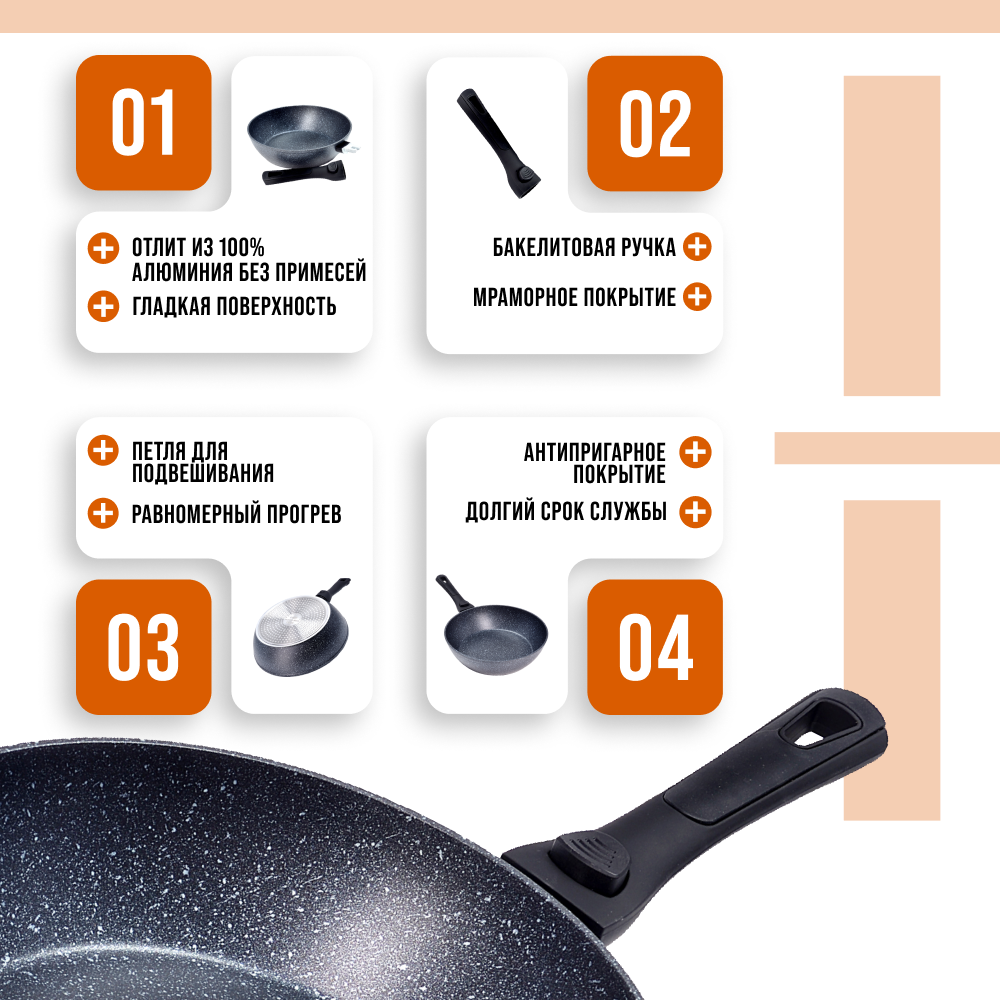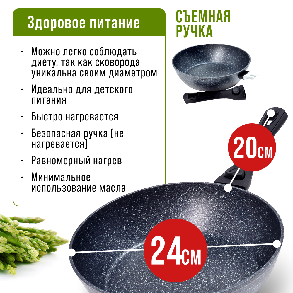 Сковорода 24 см с мраморным покрытием и съемной ручкой