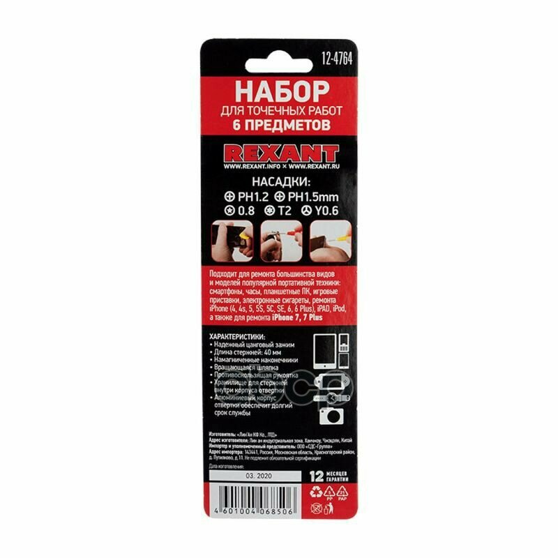 Отвертка REXANT с набором бит для точечных работ, ремонта iPhone, 6 предметов