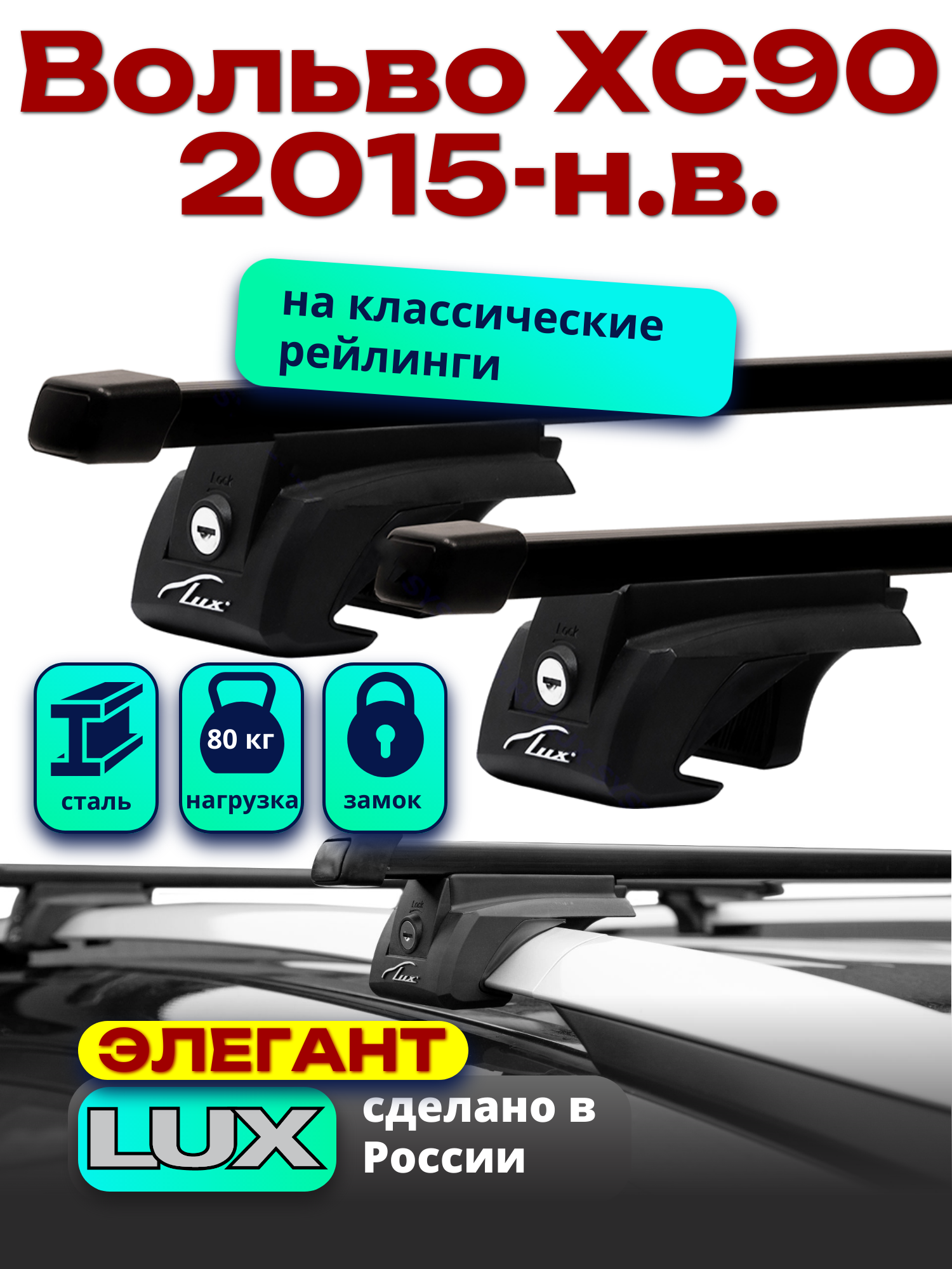 Багажник на крышу LUX элегант с замками дуги аэро-классик (53мм) 1,3м на Вольво ХС90 (с рейлингами) 2015-2022, арт:21325-23