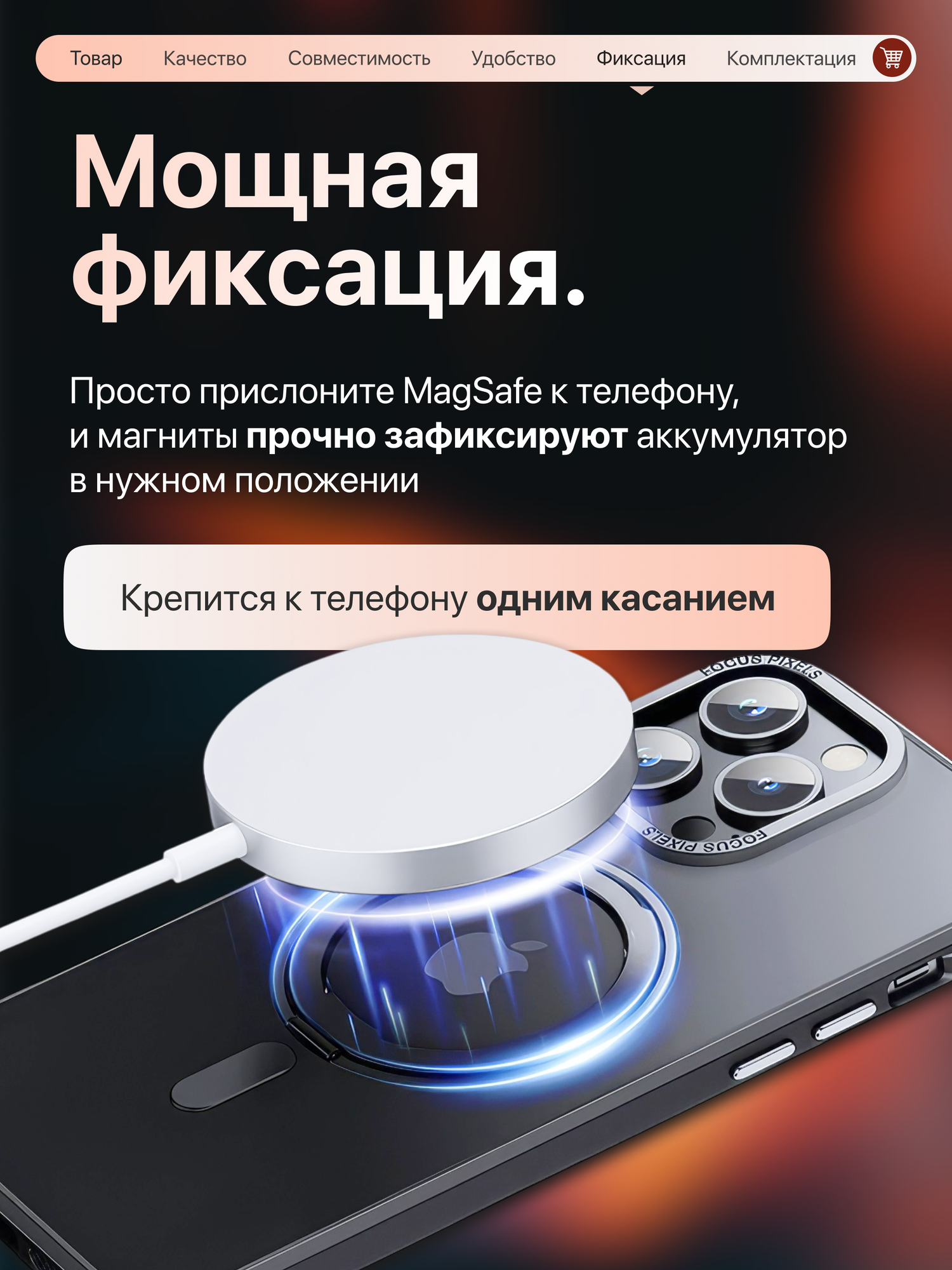 | Плюсы: | iPhone 12 Pro max, 13  Pro max Заряжает примагничивается к задней стенке, что очень удобно |