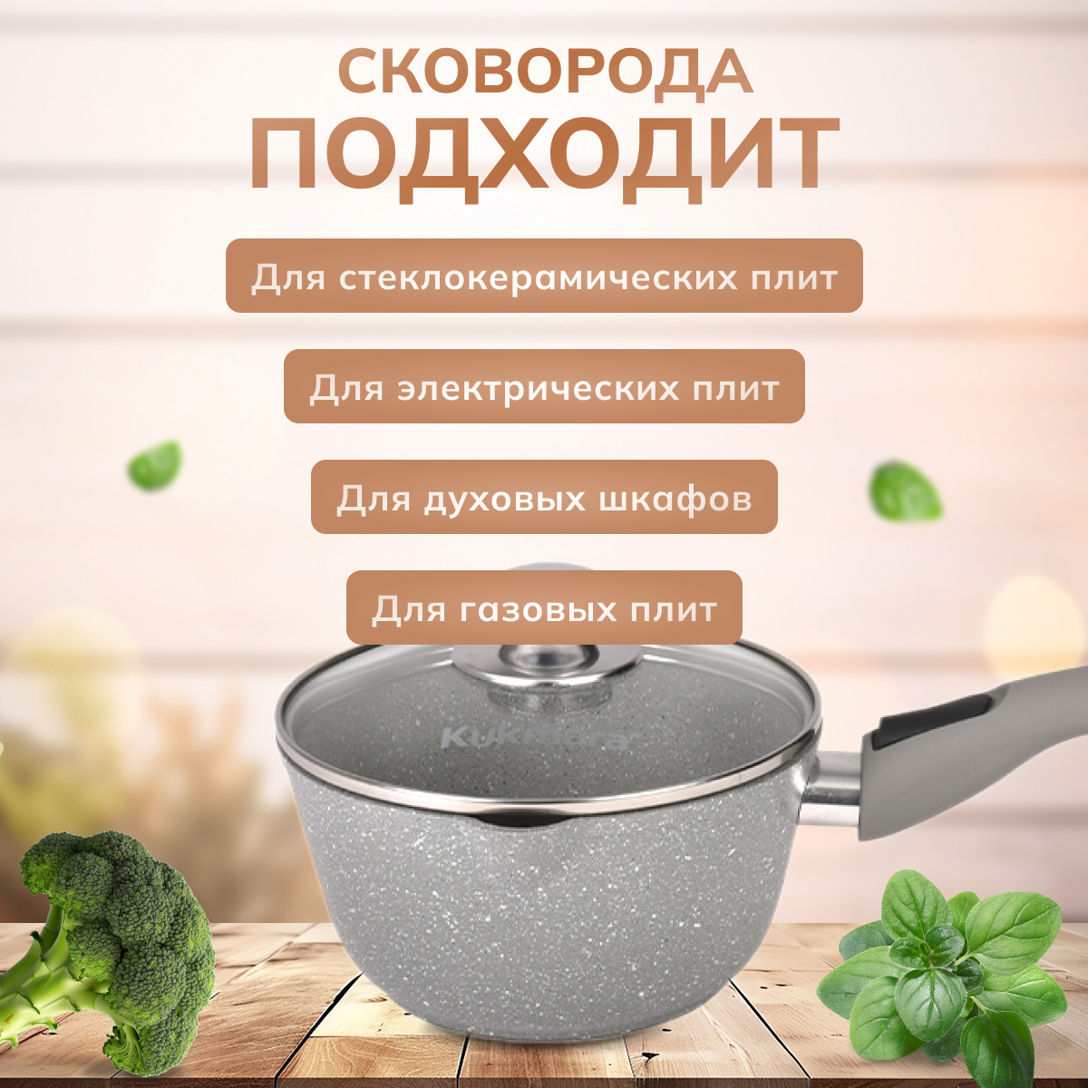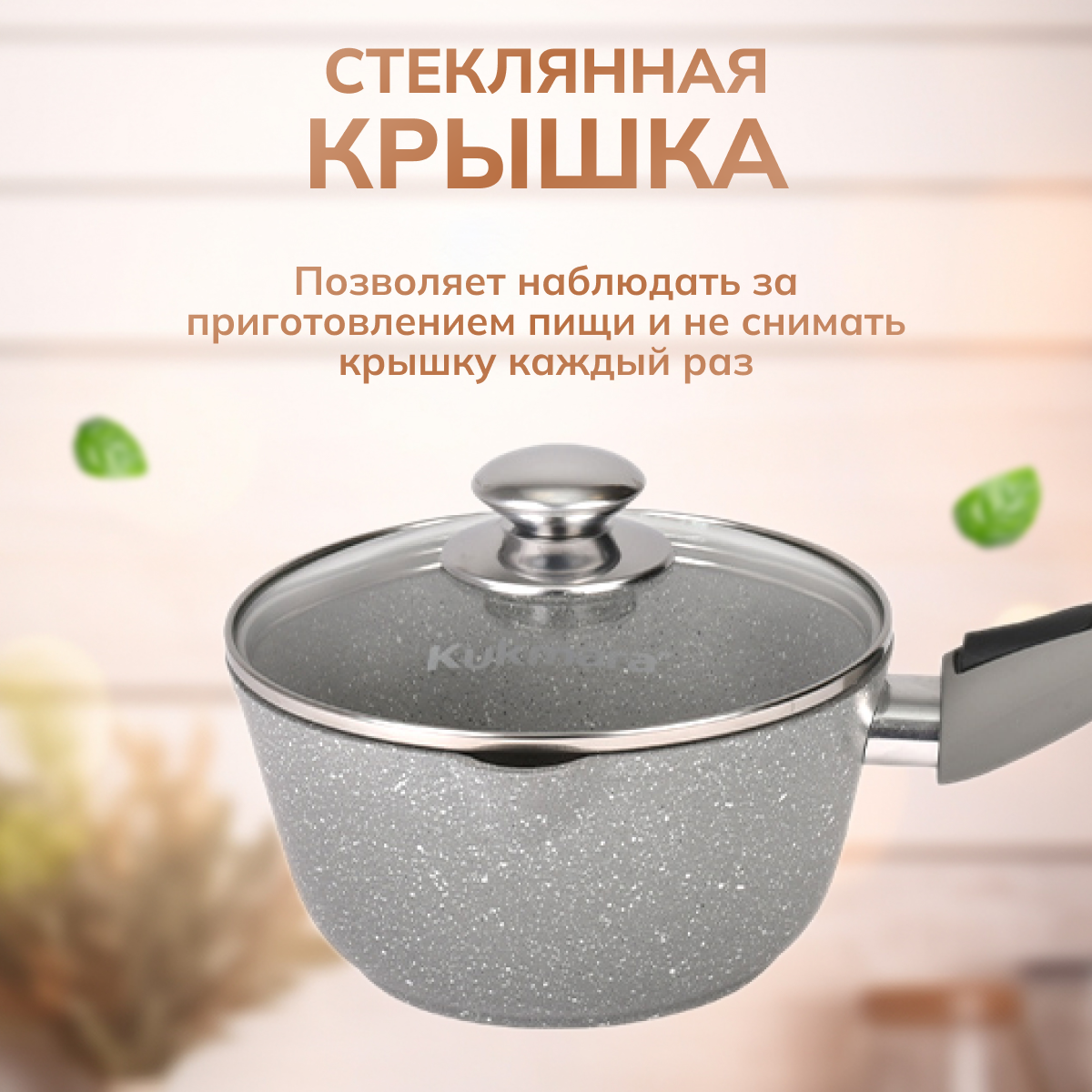Ковш антипригарный литой 1,5л со съёмной ручкой и стеклянной крышкой Традиция TM KUKMARA
