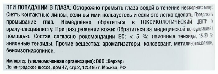 | Способ применения | залить средство в баллон насадки или присоединить емкость к разъему Connect ’n’ Clean, установить дозировку в зависимости от загрязненности и нанести при помощи аппарата высокого давления, дать средству немного подействовать, обработать поверхности щеткой и промыть их затем струей высокого давления, не допускать высыхания средства на очищаемой поверхности. |
