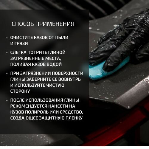 | Способ применения | очистите кузов автомобиля от пыли и грязи; слегка потрите глиной загрязненные места, поливая кузов водой; при загрязнении поверхности глины заверните ее вовнутрь и используйте чистую сторону; после использования данного средства рекомендуется нанести на кузов полироль или средство, создающее защитную пленку |