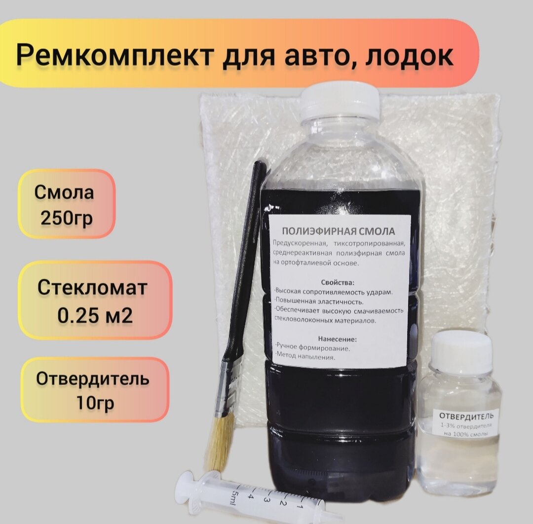 Набор смола полиэфирная 250гр с отвердителем, стекломат JUSHI 0,25м2, кисть, перчатки, шприц для ремонта авто, лодок и т. д. интересное:
