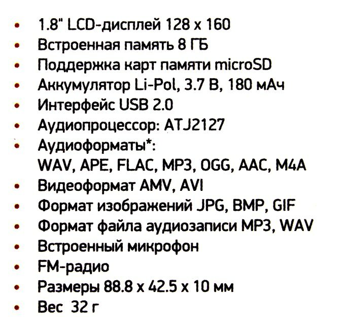 | Плюсы: | Маленький, легкий, классный дизайн. Есть внутренняя память, достаточно записать большое количество аудиокниг и музыки |