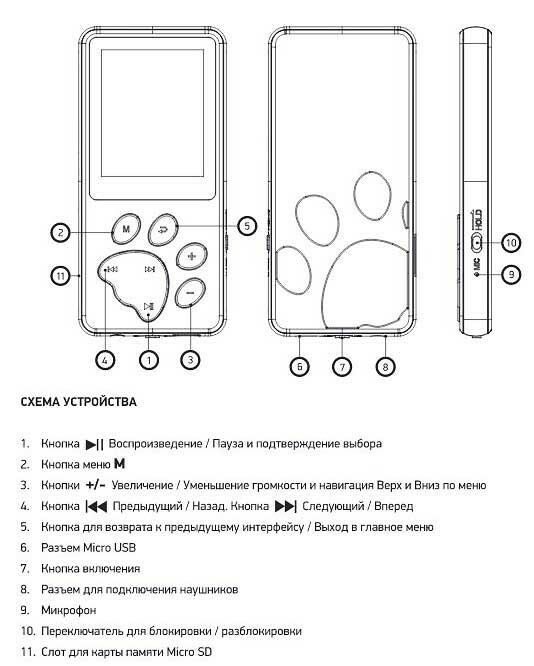 | Плюсы: | Плеер долго держит зарядку, яркий дисплей, качественный звук и корпус. У плеера интересный дизайн: кнопки сделаны в виде лапки собачки! К необычной расстановке и форме кнопок привыкли быстро. Громкость звука базируется от 0 до 31. Сбоку плеера есть двигающаяся кнопка. Если эту кнопку сдвинуть, то будут заблокированы кнопки (если нажимать на них, то отклика не будет, пока снова не сдвинете кнопку) Это очень удобная вещь, особенно если плеер лежит в кармане. Отличный плеер! |