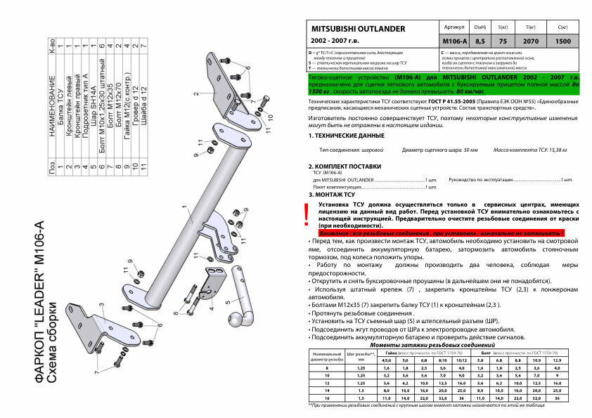 Фаркоп для Mitsubishi Outlander (2002-2007) Лидер-Плюс M106-A интересное: