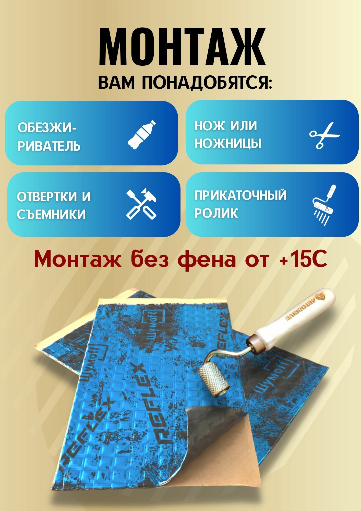 Виброизоляция авто Шумофф Рефлекс 1 - 30 листов + ролик прикаточный. Шумоизоляция для автомобиля, шумка в авто, вибропласт, вибродемпфер. Шумоизоляция для дверей, крыши, потолка, арок, пола, багажника, канализационных труб, стояка, ванны, раковины