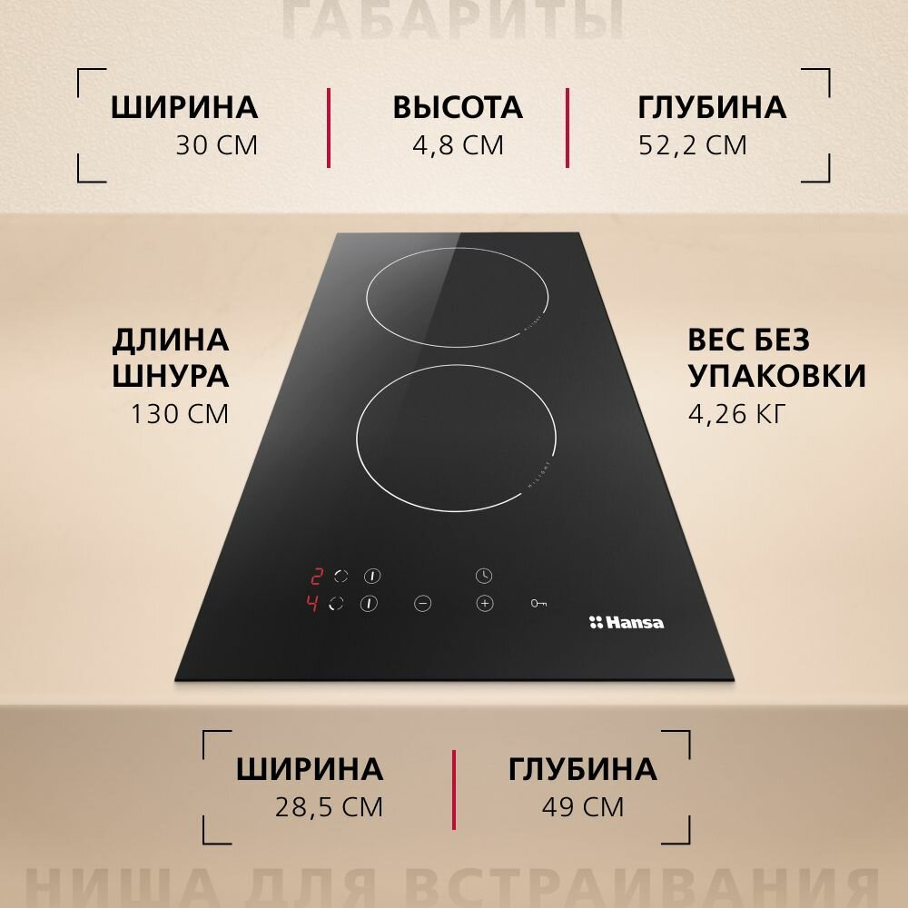 Электрическая варочная панель Hansa BHC36106, двухконфорочная, автоматика закипания, блокировка от детей, таймер, автоотключение, индикация остаточного тепла