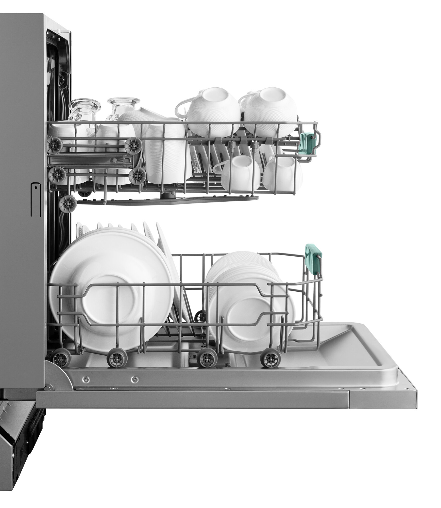 Купили данную машинку по совету знакомых, показалась не вместительной, раньше пользовались Бошш и там две корзины, лоток для столовых приборов, а тут вместо лотка дополнительная секция, в общем итоге три корзины...нужно приловчиться к расположению посуды, взяли в квартиру студию, она реально тихая, корзины выдвигаются по максимуму, моет видимо из-за трёх распылителей, очень хорошо, посуда сухая, открыть/закрыть во время мойки-легко, но есть некоторые моменты, у нас вся посуда больших размеров, тяжеловато разместить, недостаточно высоты и если посуда поместилась, то есть следующий косяк, дверца для таблетки не может открыться из-за высоты посуды,т.к дверца откидывается в верх для освобождения таблетки и конечно же не хватает луча оповестителя,нет половиной загрузки.