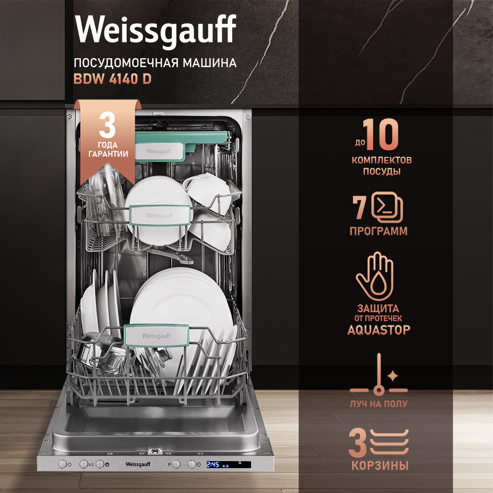 Встраиваемая посудомоечная машина с лучом на полу Weissgauff BDW 4140 D (модификация 2024 года), 3 года гарантии, 10 комплектов, 3 корзины, полная защита от протечек, автопрограмма Blitz Wash, половинная загрузка, дополнительная сушка, таймер