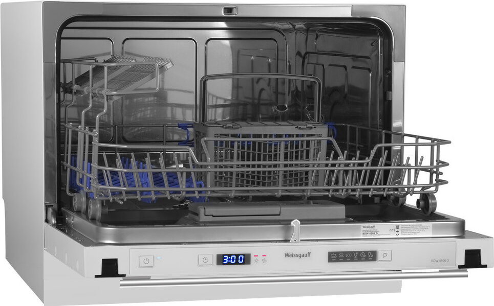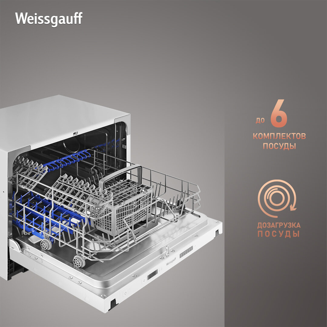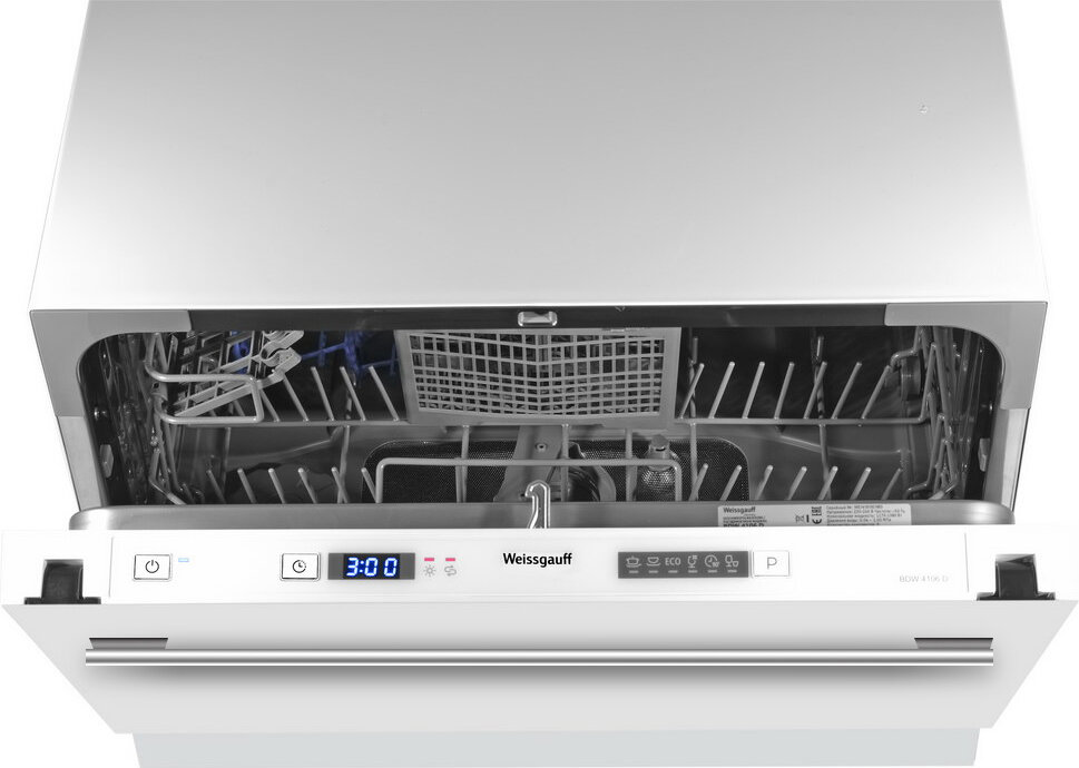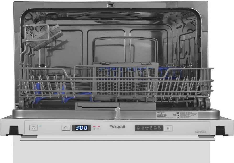 Встраиваемая компактная посудомоечная машина Weissgauff BDW 4106 D,полная защита от протечек Aquastop, 3 года гарантии, 6 программ, 6 комплектов посуды, цифровой дисплей, таймер, дозагрузка посуды