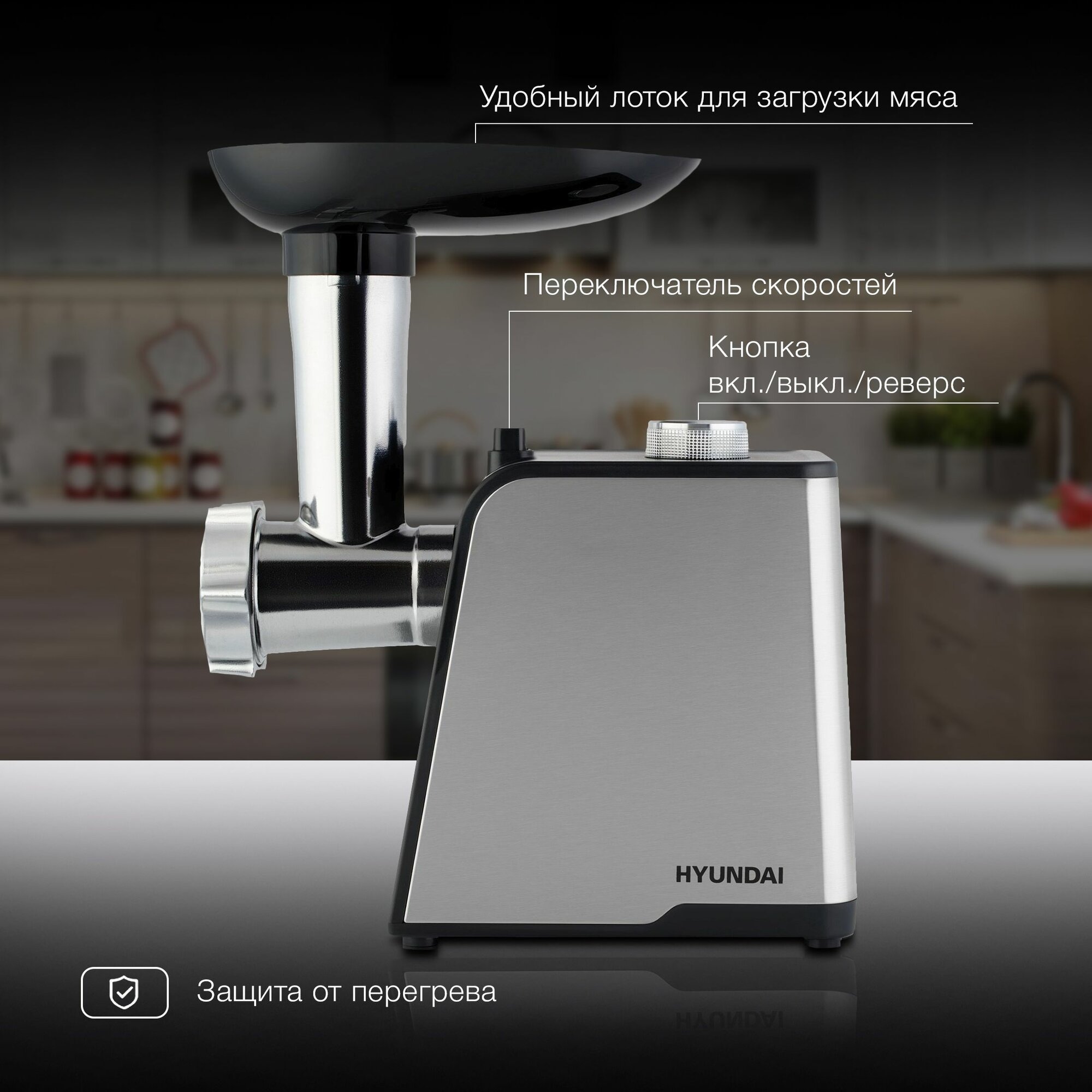 СохранитьМясорубка Hyundai HY-MG2214 серебристый/черный, Мощность 1800 Вт, Насадки для колбас и кеббе, Реверс, Производительность 2.2 кг/мин интересное: