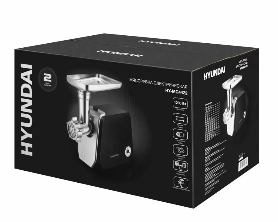 СохранитьМясорубка Hyundai HY-MG4422 черный/серебристый, Мощность 1200 Вт, Овощерезка, Соковыжималка, Насадки для колбас и кеббе, Реверс интересное: