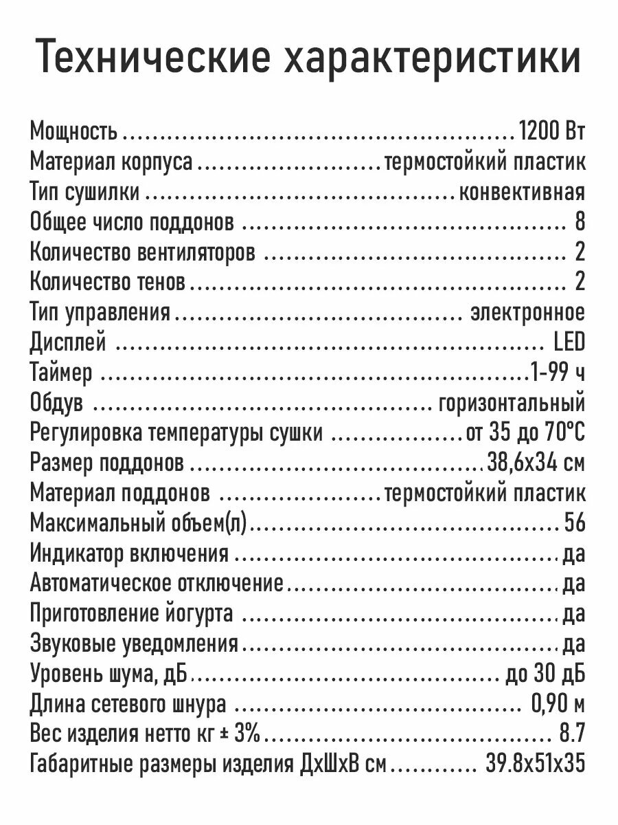 | Дополнительные функции | приготовление пастилы / приготовление йогурта |