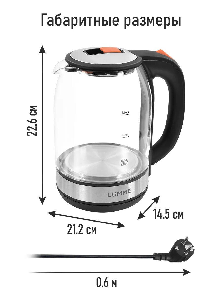 Электрический чайник LUMME LU-KT4109A черный стеклянный с подсветкой, 2 л