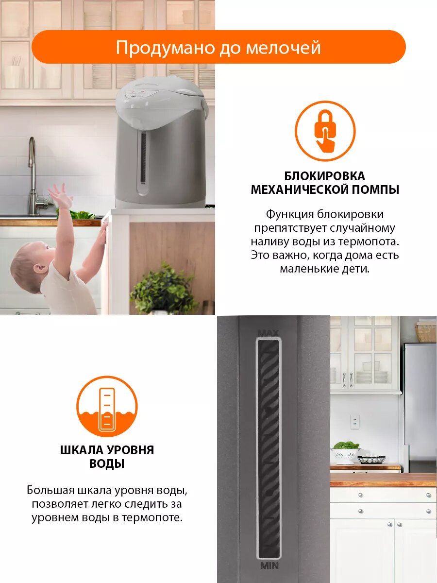 | Минусы: | После кипячения пластиковая защёлка не закрывается. Верхняя крышка с помпой оказывается негерметично прилегающей к основному корпусу. Это и опасно и некрасиво. Как только вода в термопоте остывает, верхняя крышка защелкивается. |